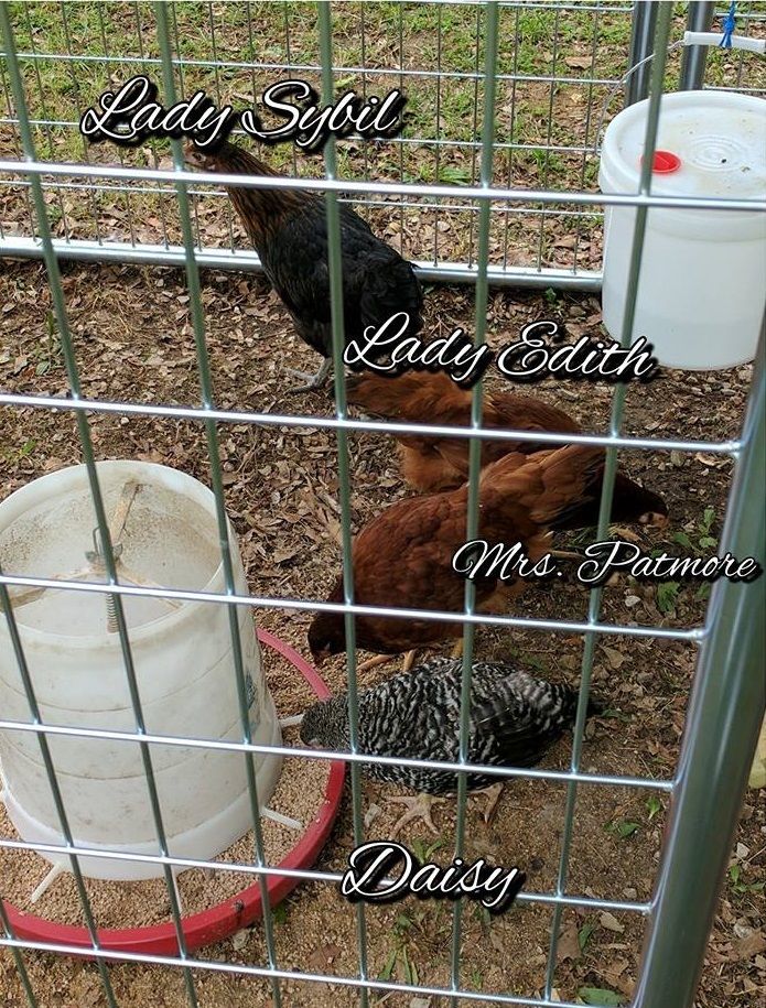 The following four hens are also guesses, but the person we got them from gave us an idea of at least two. Hen C, the top hen, Lady Sybil, I guessed a Copper Black Maran as the farmer told us she will lay very dark chocolate eggs. We were told hens D and E, Lady Edith and Mrs. Patmore, were Rhode Island Reds. Lastly, we're guessing hen F, Daisy, is a Barred Plymouth Rock. These four pullets have not begun laying yet.