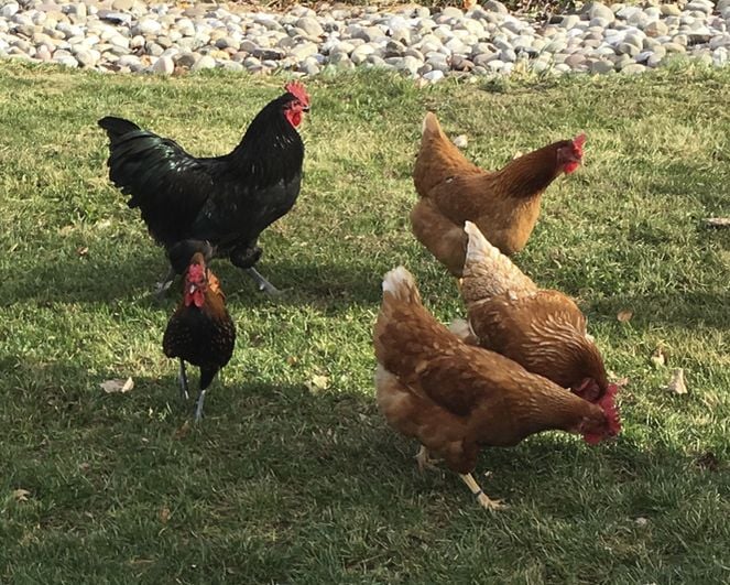 We currently have 6 hens, and two roosters - a black australorp (called Oreo) and a bantam golden sebright (Hawkeye)