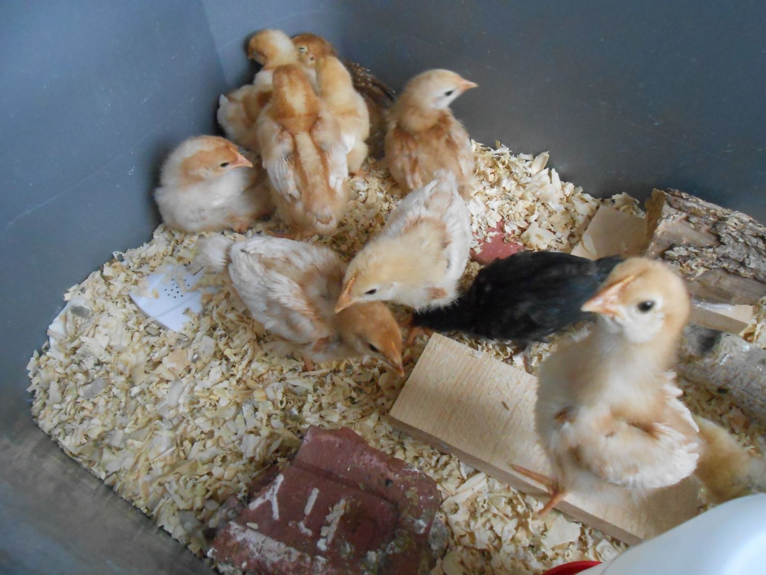 The rule of thumb is you never put larger chicks with smaller chicks they will bully until the smaller ones are dead. when the smaller ones are full of strength and grow nice wings and shoulder feathers that might be a good time to introduce them but supervise it carefully, if there is any pecking at the feet,beak,eyes, or head aggressively then you need to wait a week then introduce them again, what I did since I didnt have two brooders is I just put distractions in the brooder such as duct tape, they like shiny things, and you can also put a button on a hanging string, they like things that move because they like to chase, and every morning I also cut some thin grass up as small as I can get it and sprinkle it all around the brooder and they actually get there vitamins and protein they need through little bugs you find outside and grass. so there is no need for medicated water or food, you just need to give em a taste for things outside. Hope this helped, much love