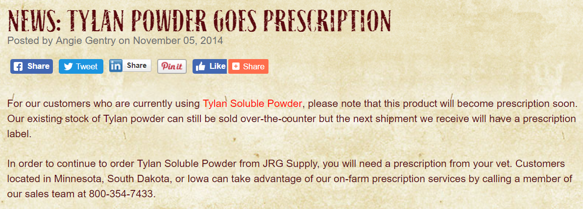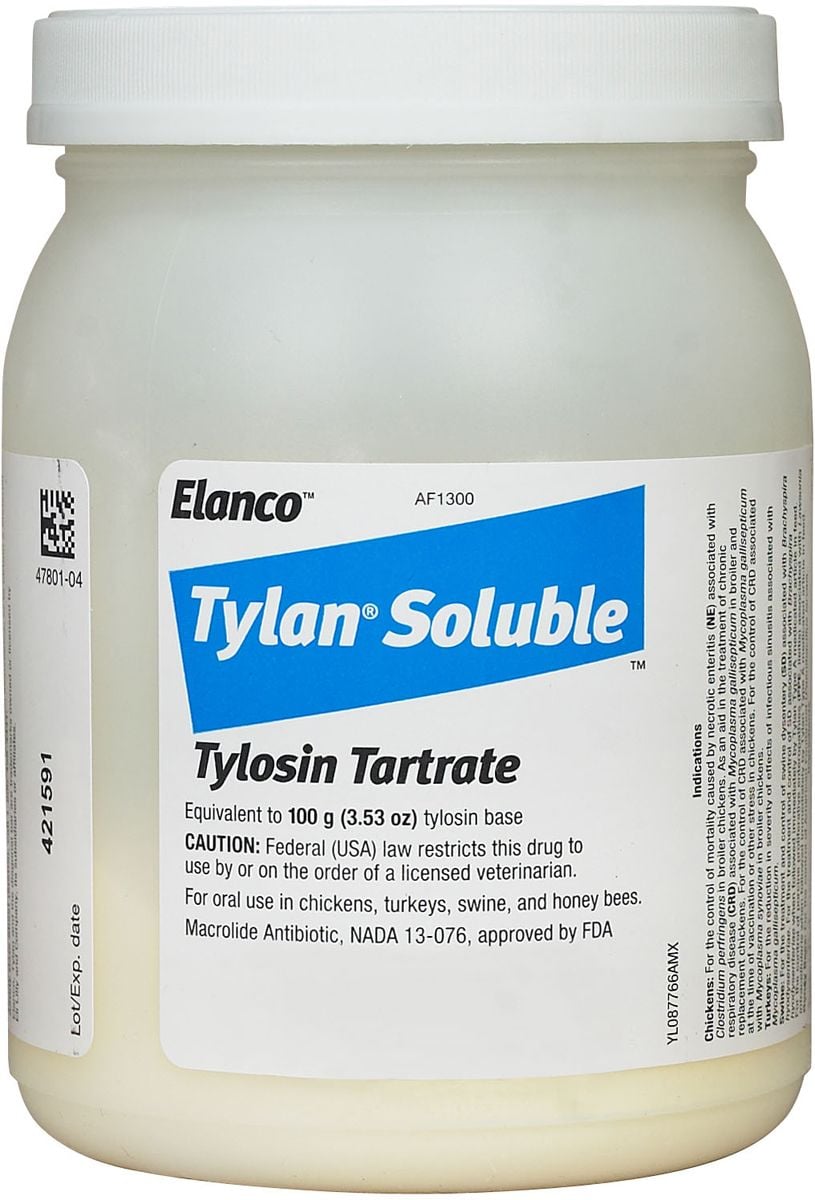 Tylan is water soluble powder containing 100 grams of tylosin tartrate per container. Labeled for chickens and turkeys in the treatment of chronic respiratory disease.