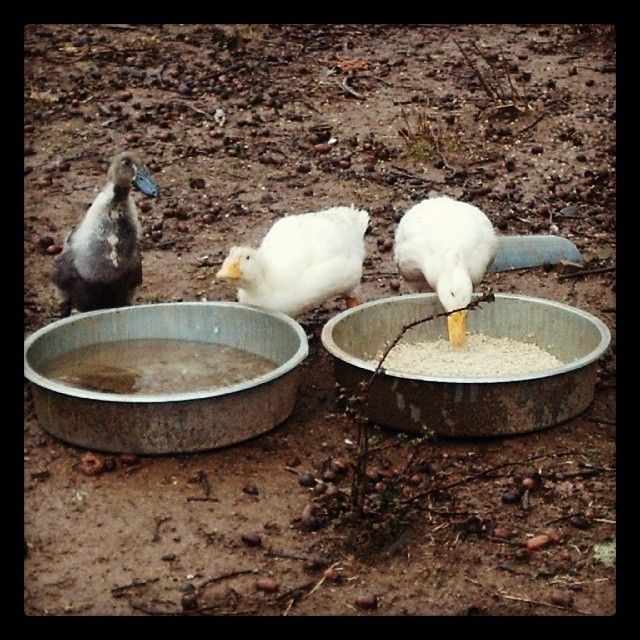 On April 1, these three were waddling down the road, scooping water out of puddles and looking generally distressed. I gently herded them into my chicken coop, hoping to at least contain them so they didnt get smooshed on the road while I tried to find their owners. A pan of crumbles was out in the coop and the three ran over and started scarfing down the food - clearly they hadnt eaten in some time.