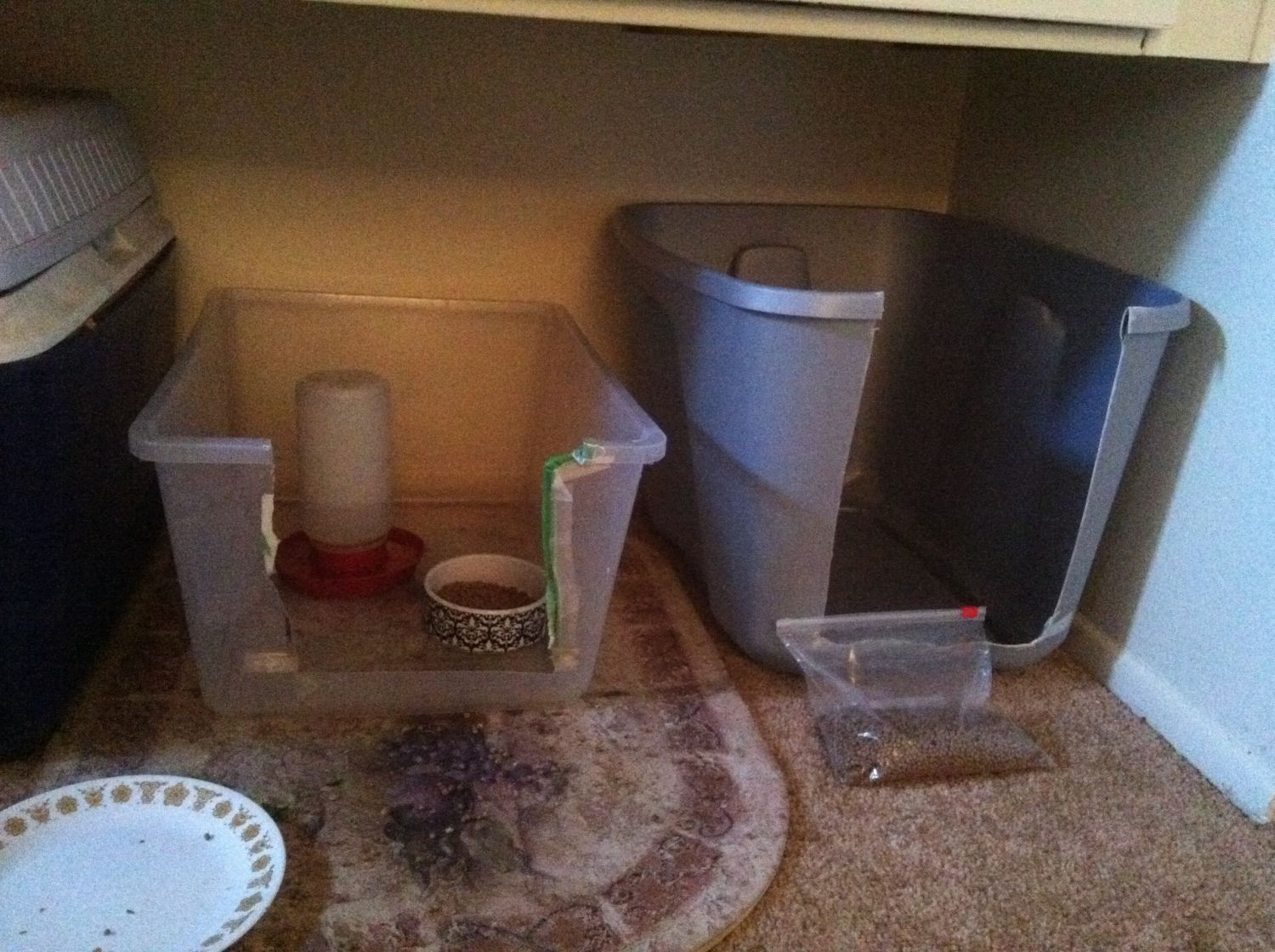 Similar to what we have here in the basement pen. It's the bottom half of a large plastic dog crate, so there is a doorway they can step through, but with a raised sill.Right. So I have their food and water dishes in a rubbermaid bin. This way when they make a mess, I can easily rinse the bin out with a hose or even in the shower.