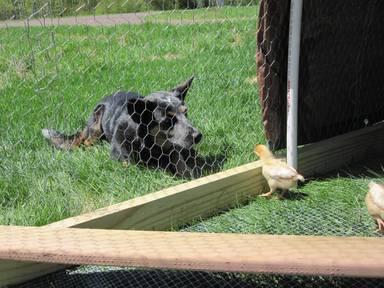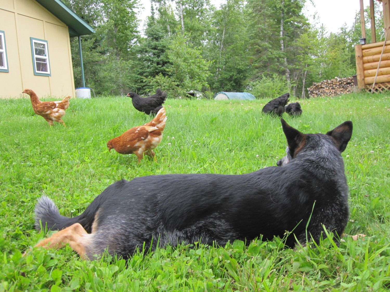 swimM4r - Is your dog a herding breed? (looks like it from your profile pic) They're so smart, I think they understand the chickens are now part of the family and are to be protected. You might just want to keep an eye on the intense focused staring, that's what my dog would do before he would snap at them. I would correct him when I saw that look, and reward whenever he would just lay next to them and relax. You just have to be able to read your dog. But it does sound pretty promising if he's been around them so much without making a move.