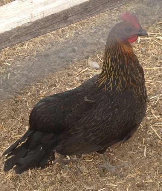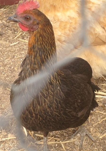 The other chickens I got from the neighbor are this black hen and rooster. These two hang out together all the time and the rooster wants nothing to do with the other yellow hens. This hen lays one egg every other day or so, off-white average size egg. I am thinking of incubating a few of her eggs to see what happens. Her eggs do appear to be fertilized. I am to keep her as long as she is providing eggs.