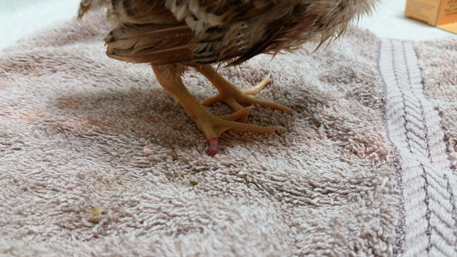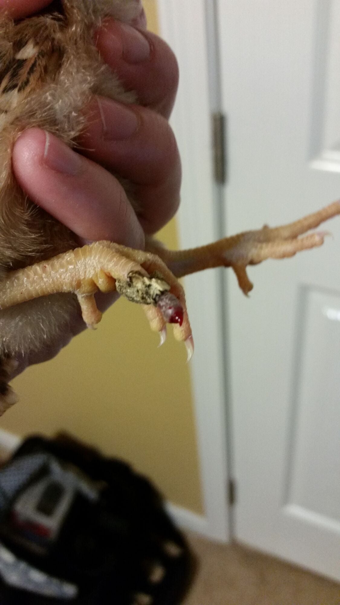 I have a 2 week old Rhode Island Red pullet (Pepper is her name). I heard the chicks get into an excited chorus and I checked in on them to calm them down and see what was going on. Pepper has what appears to be a missing toenail. I'm not sure if it came from the dried poop on her foot causing an infection (was not there for long if I recall, though it was dried, so maybe it was on there longer than I realized.), or if in the excite it somehow got pulled off. There was just a little bit of blood, and the first pic shows what I saw at first. I soaked it in warm water and put a little bit of neosporin (Thanks BYC!) but I'm not sure where to go from here. She's not limping too bad, just a little owie like if someone had their foot fall asleep. When she stands she will put some weight on it, but she'll also hold her foot up, so she switches between the two. She didn't seem to be in shock as she flapped her wings a little bit when I was adjusting her on the towel to get a better picture. 20 minutes have gone by and she is eating and it appears the swelling has gone down.