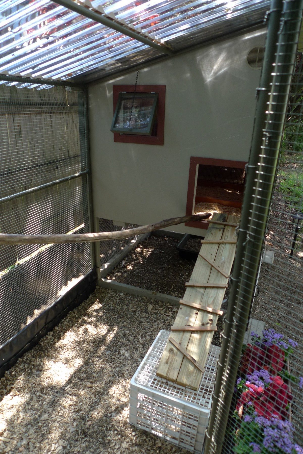 my 10 week old bantams are afraid to descend down their coop ramp. The pictures are taken while my coop is in the garage but I've had them in the yard and they still won't go down into the grass. From other forums I've read, my ramp isn't too steep. Any advice on getting them to go down ? Thanks.