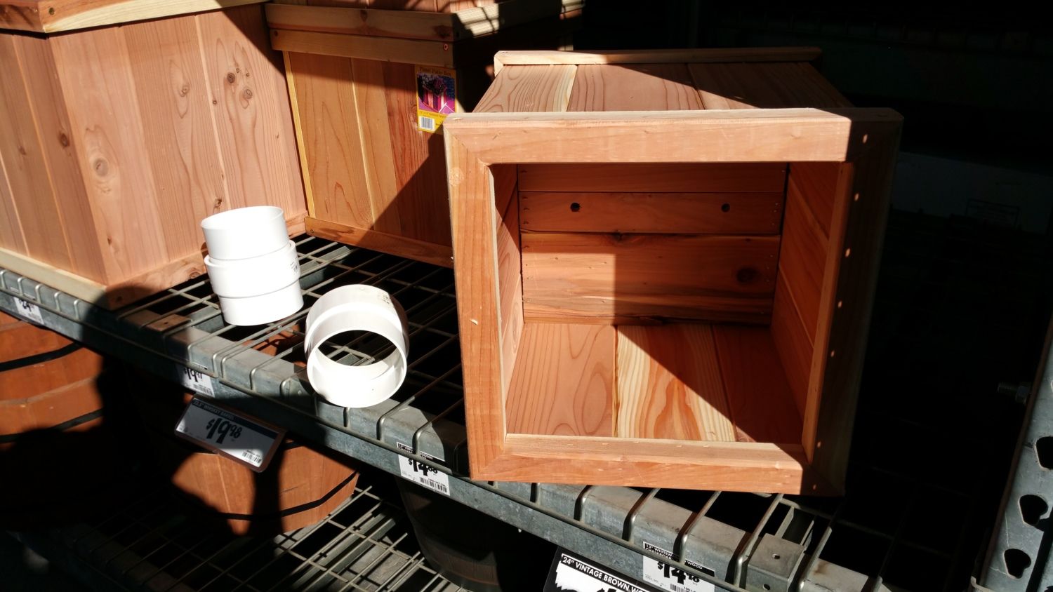I originally planned on building some boxes inside with scrap plywood I have around, but that is a lot of work. While at Home Depot I thought about using 5 gallon buckets and modifying them, but they aren't big enough. Then I looked at plastic totes. It would work, but I would like something a bit nicer even if it is concealed inside. Out in the garden section there were pots, and some really nice wooden barrel types. They weren't cheap though.