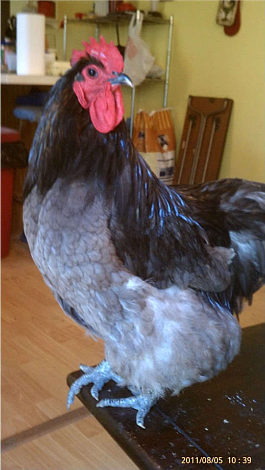 Dutch was an awesome Barred Rock rooster, son of my very beloved, late Hawkeye, younger brother to my crippled rooster, Zane. He had the big sturdy build you want in a BR, unlike many hatchery Rocks, was just exemplary. He was non-aggressive, only bit a couple fingers at the age of 8 weeks old and the aversion therapy of holding his beak shut I've mentioned previously fixed that. He never bit, rushed or flogged, very easygoing and sweet.