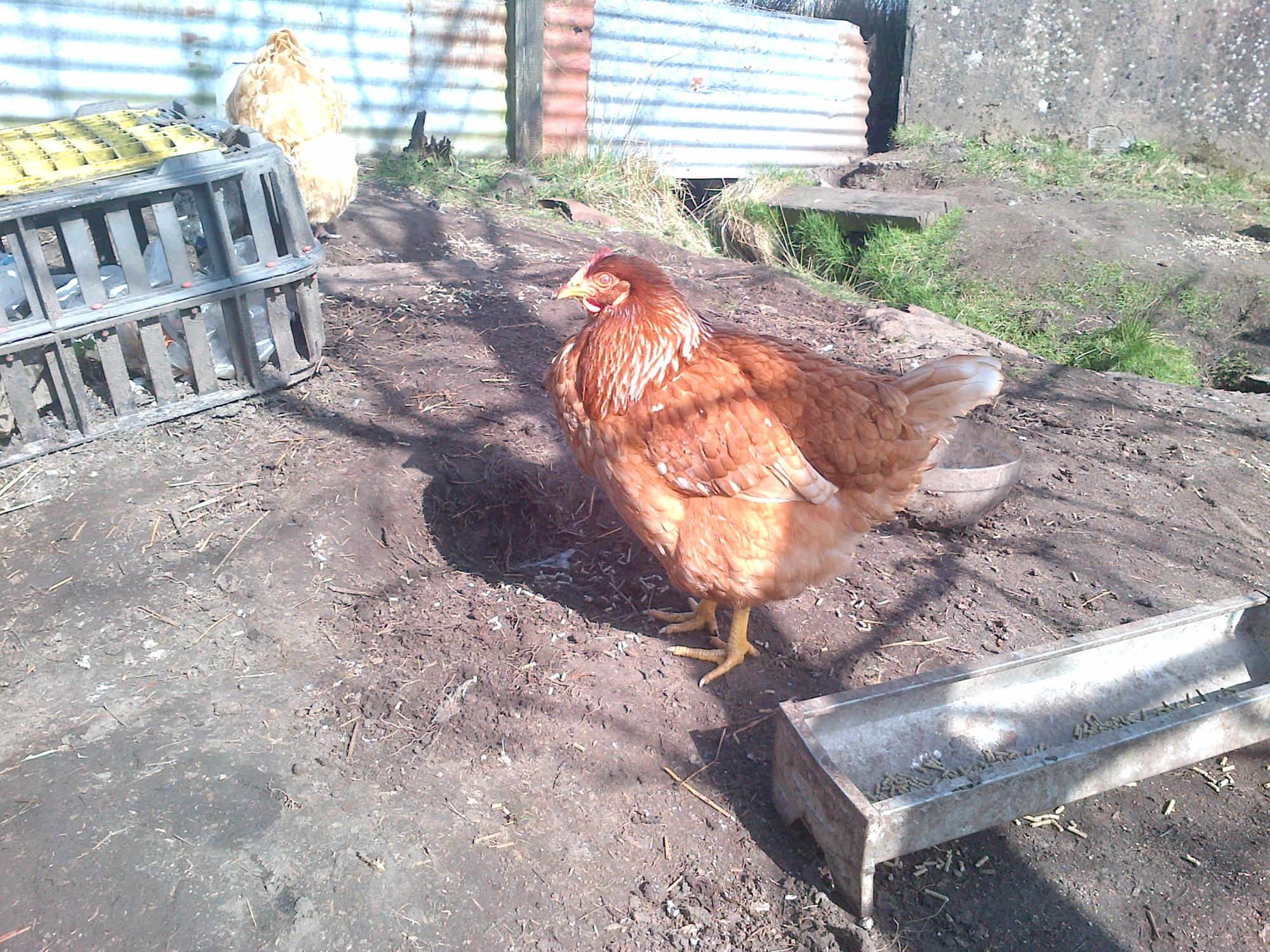 Flora sitting miserable in the muddy pen instead of going out free ranging in the feild, she does not enjoy cold and windy weather