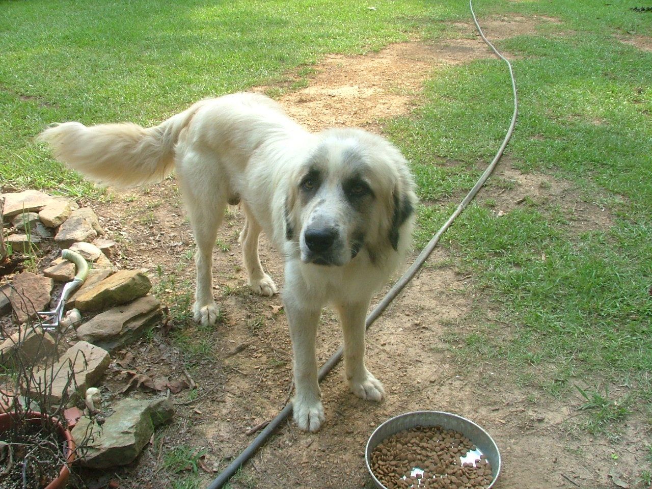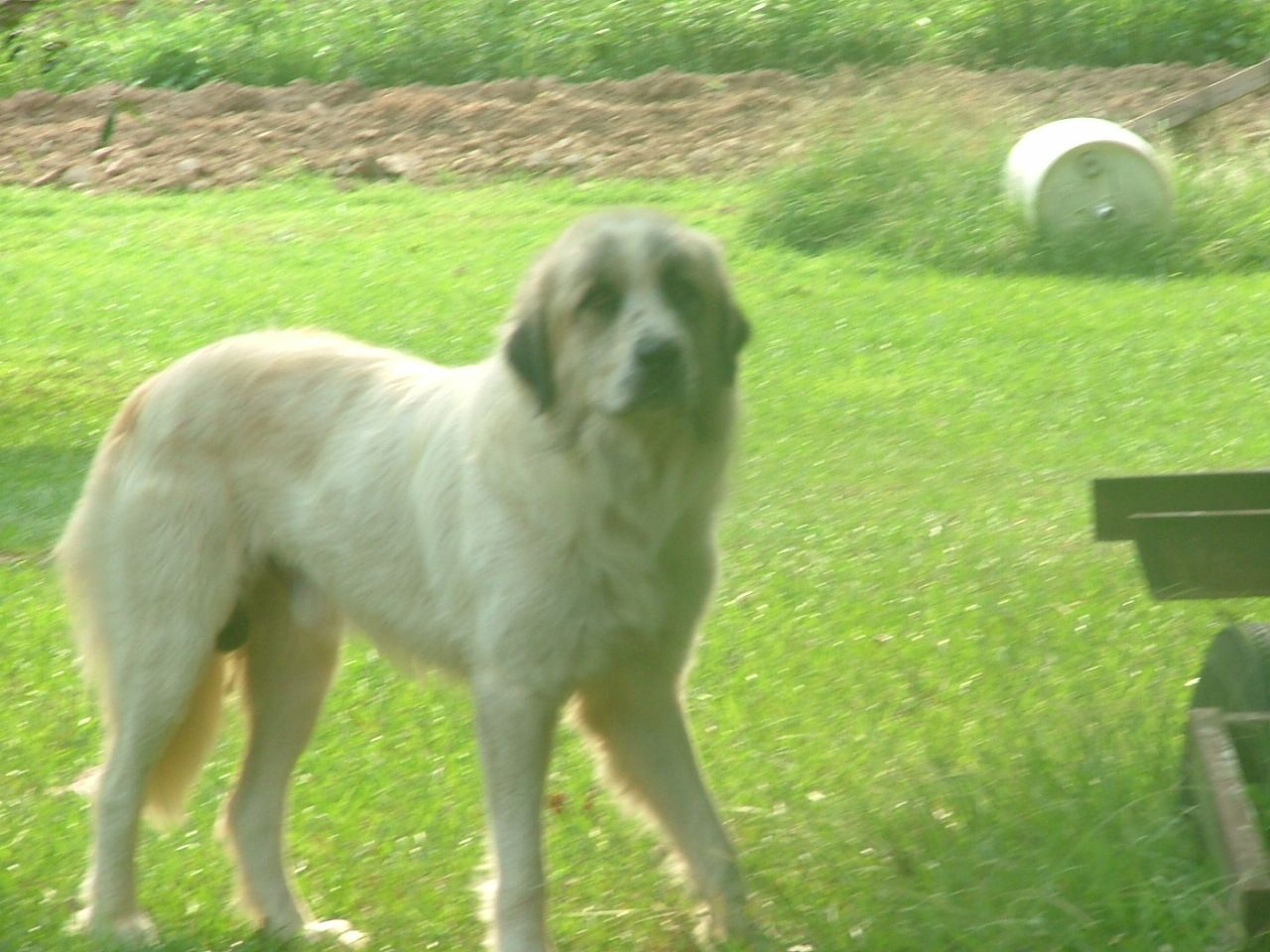 I would guess he weighs about 75-80 lbs. He has been raised around animals of different types all his life. When I got him I left him in the chicken run for about 4 days. The chickens sat on top of him. I let him out after that so that he could patrol the property. He began to roam when I went back to work this past Mon. He stays at home as long as someone is here. But I work 5 days a week. I feel like if someone could be at home with him, he would stay around.