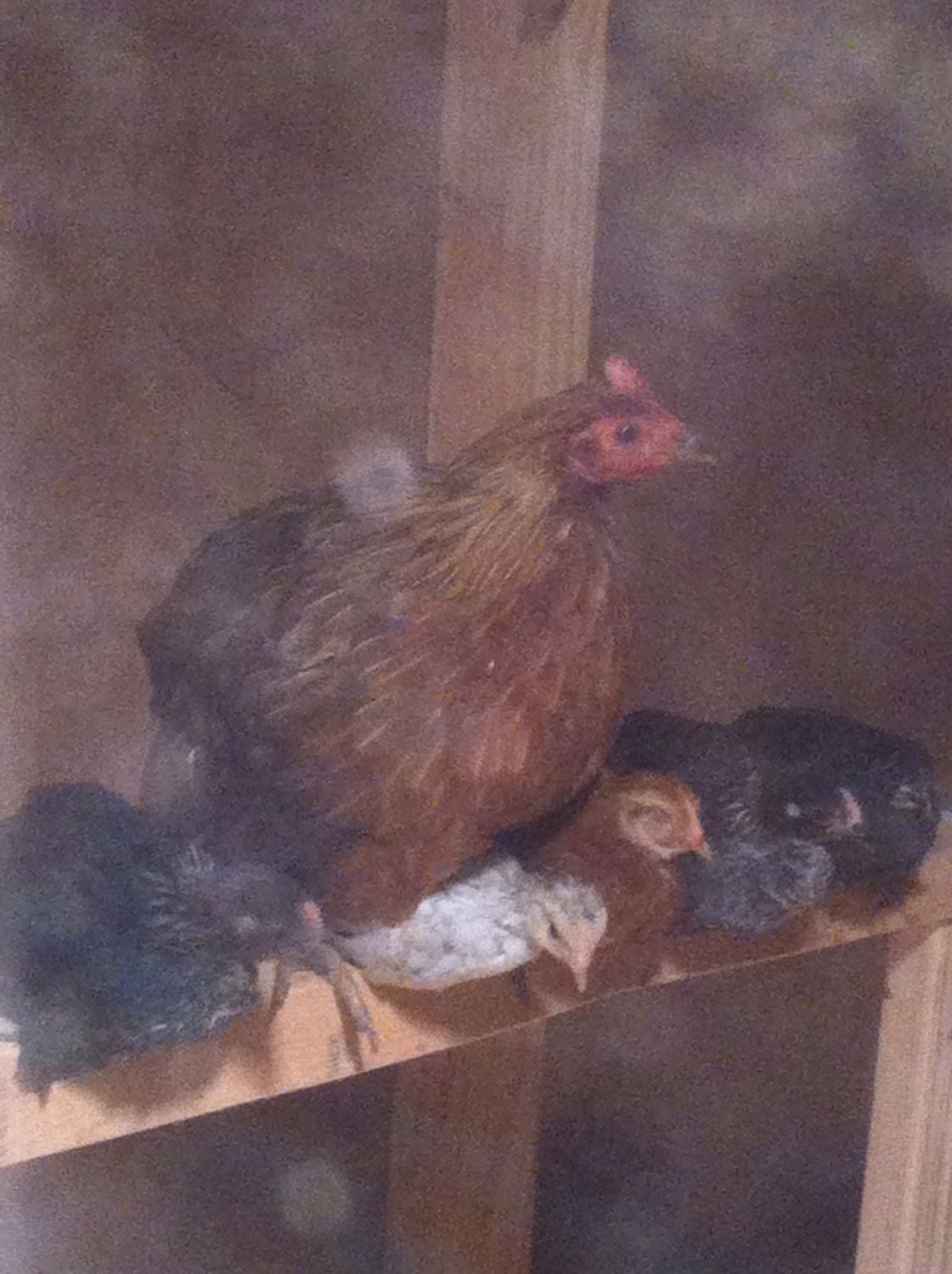 These are my 5 unknown breed/gender chicks and the Momma hen that came with them...LOL. She is some game type looks most like a Phoenix so that is what I call her. She has one spur on her left leg.