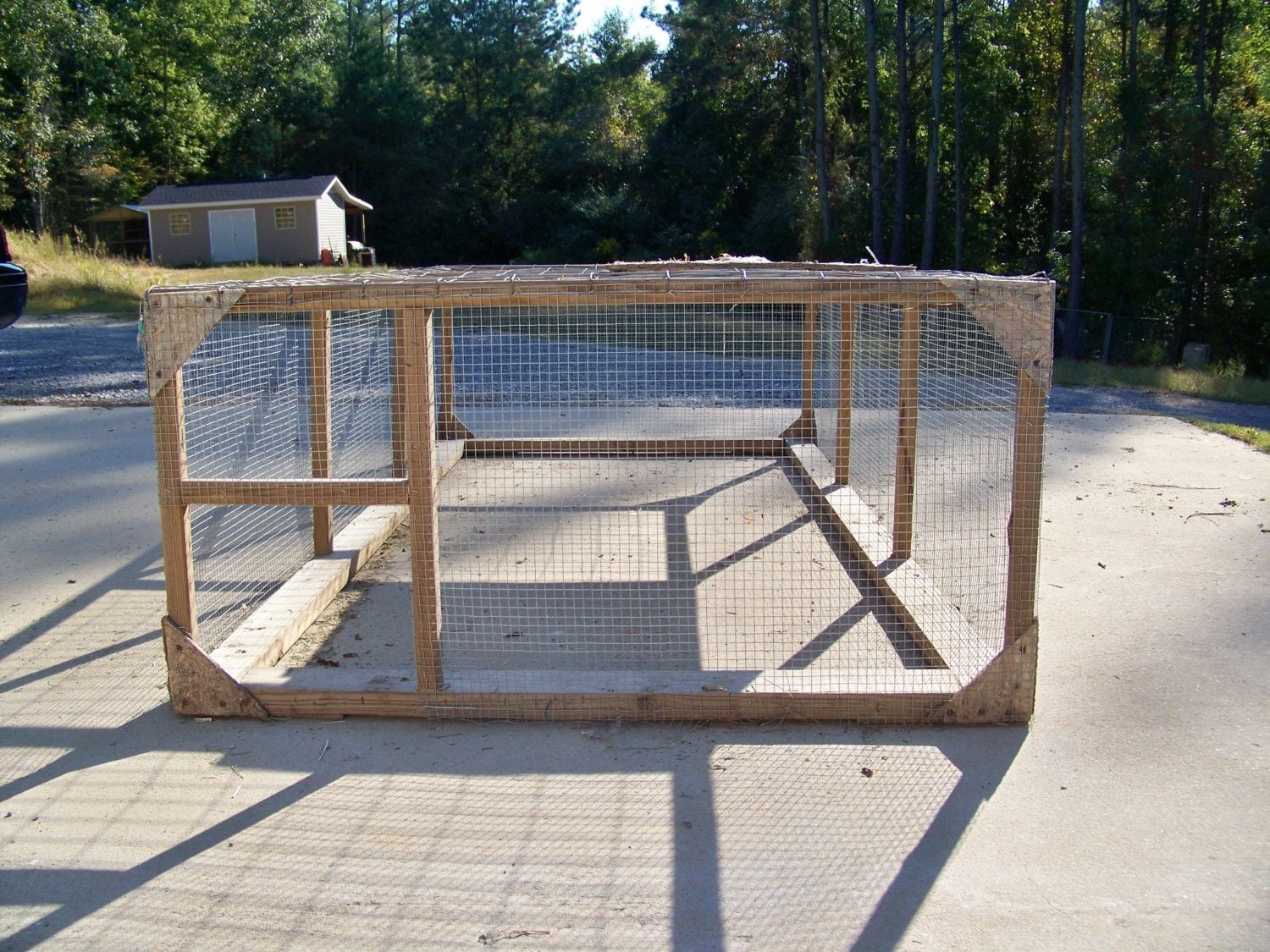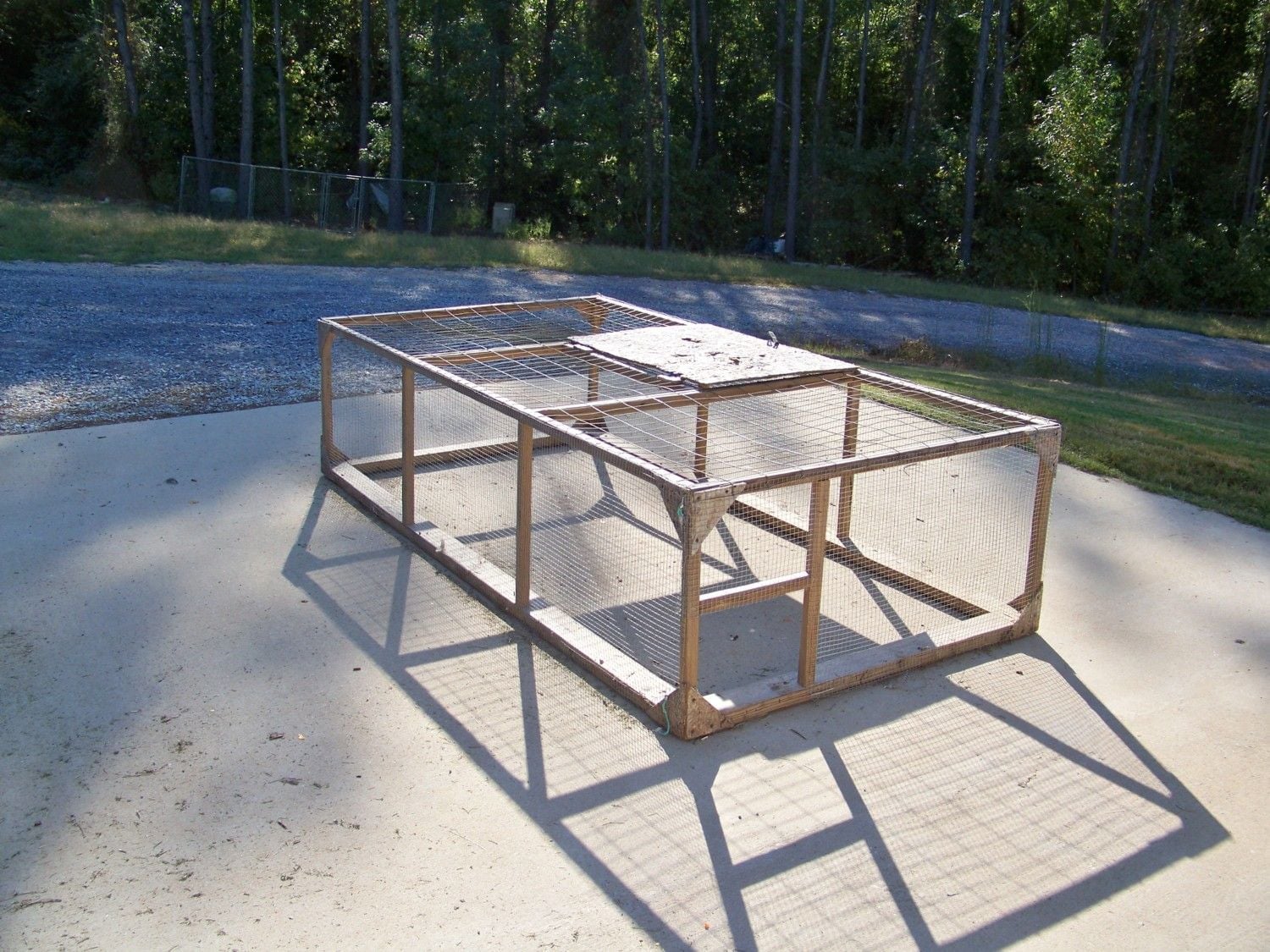One of my favorite pieces of equipment is what I call a ground run. It is a 4x8x2 frame with a large opening on the top and a pop door sized opening on one end. I use it for everything, including a tractor. Mine has a 2x4 base frame and 2x2s above ground with 1/2 inch welded wire on the sides and 2x4 dog fencing on the top. The opening on the top is just covered by a piece of dog wire cut larger and fastened on one side to make a flap.