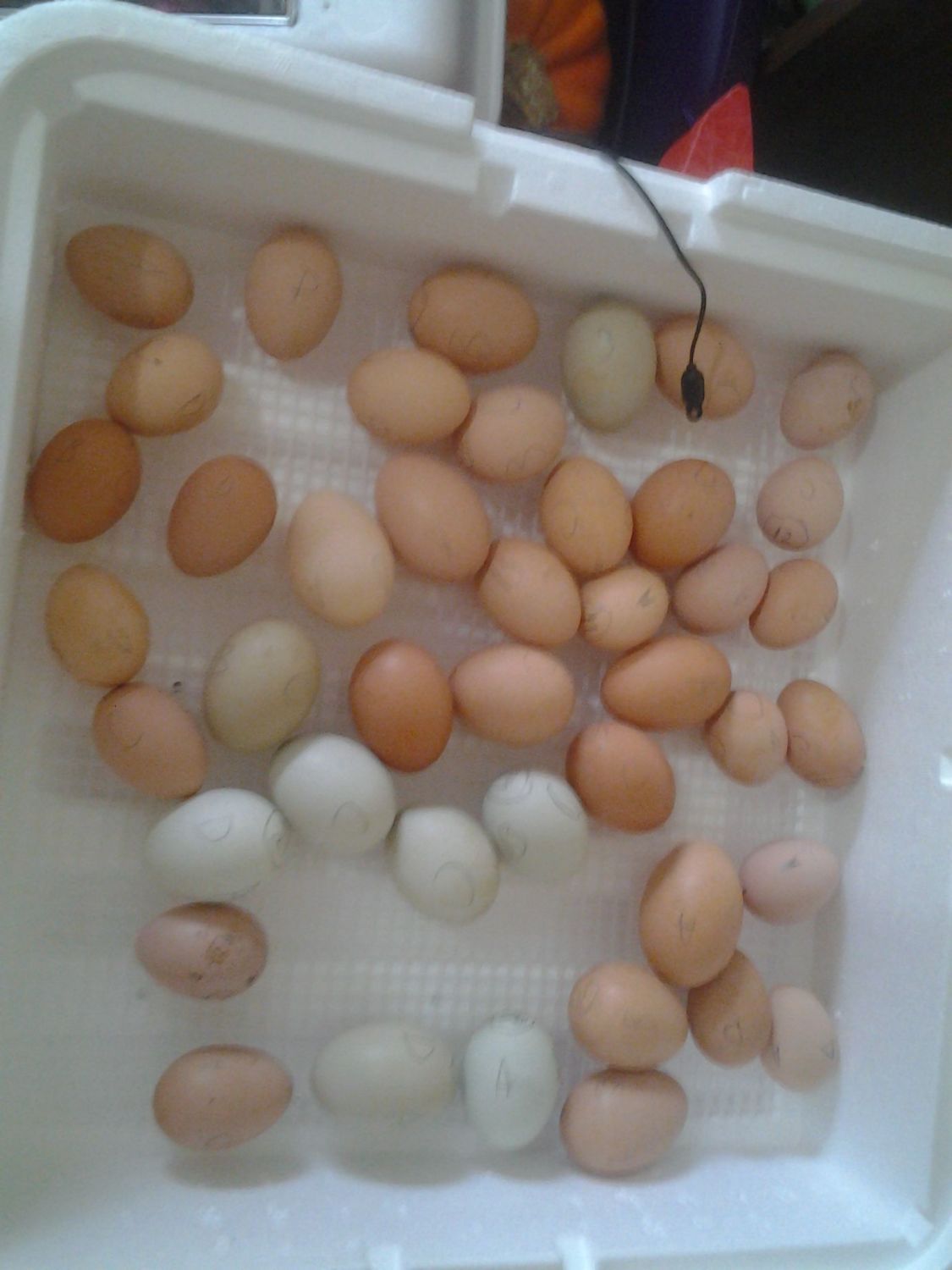 these are practice eggs from a friend. He wants chicks and i need experience incubating. Wisher has been coaching me. Shes cool as a fan. They are pretty eggs but the chickens are hideous looking. I asked him what breeds lay his blue eggs and he called em junk yard dogsfrom the leroy brown line.Yay! Fun! Pretty egg basket too.