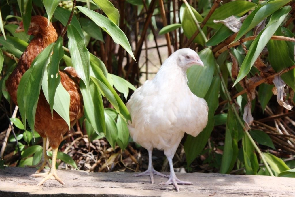 The male is a Leghorn cross which produces brilliant laying hens, and the hen was an auracana cross. Neither show signs of albino traits nor have a known history of albinoism.