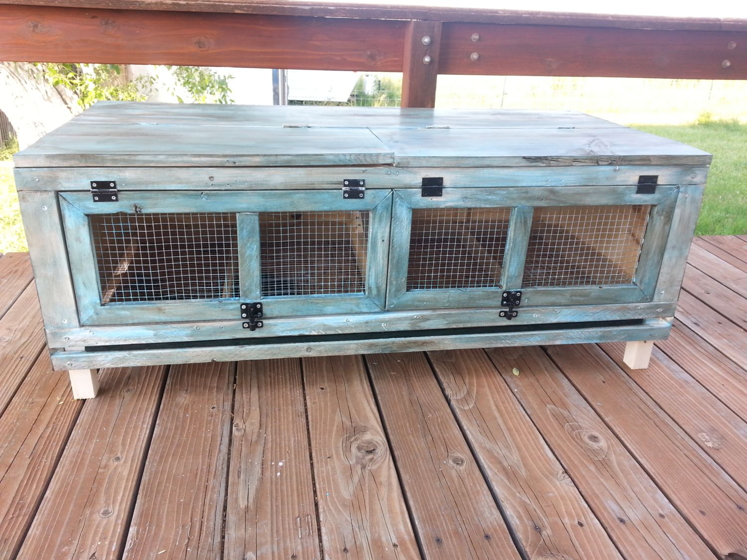 Ducky 13 I thought I'd share this because its similar to the picture you shared, and is close to your size an function requirements. Just hatched a few cot quail, and built this two compartment coffee table and quail hutch combo. It has 1/2" hardware cloth, a poop tray for cleaning, and each of the two compartments are 2'x2'. The front of each side swings open and has secure latches. So does the top half on each side. The slight elevation from legs allows for some air flow, and provides some protection from mini predators, the poop tray creates a fairly secure barrier also. I also wired two ceramic bulb bases into it, for a heat lamp in each side. So far the quail love their home. Pictured above is the 95% finished hutch on the deck outside(although its inside at the moment), and unfinished hutch inside being used as an indoor coffee table(its easier to see the design in its unfinished state). I never build anything that isn't dual purpose or meets our needs exactly. Hope this helps you with your build.