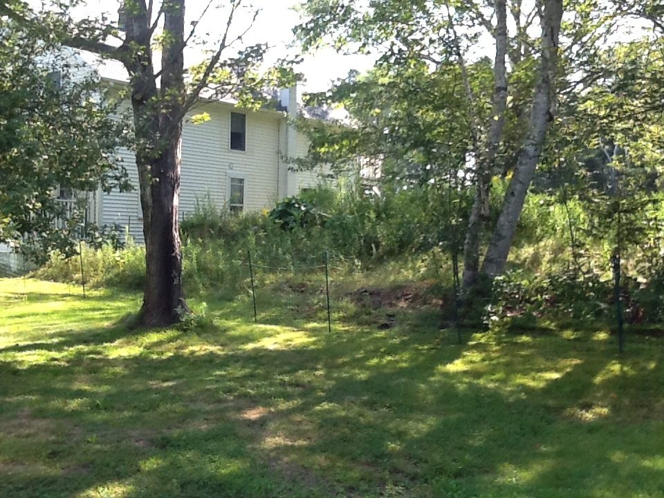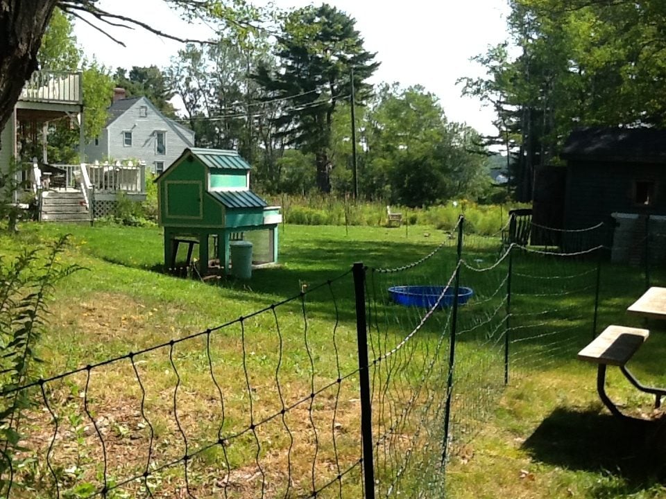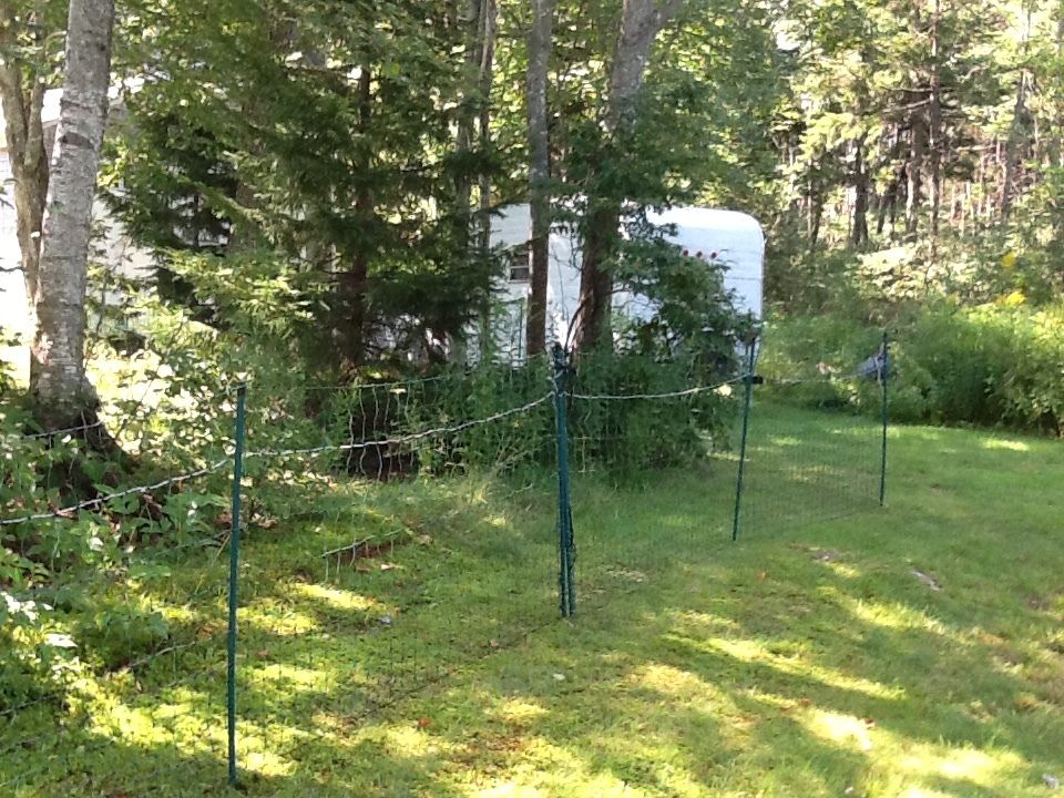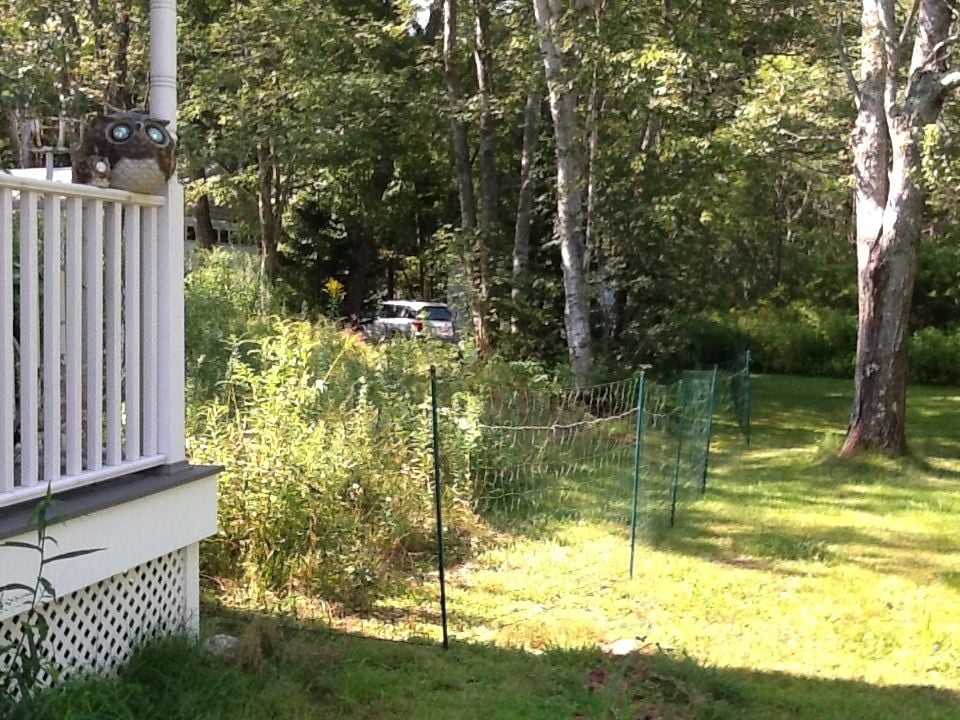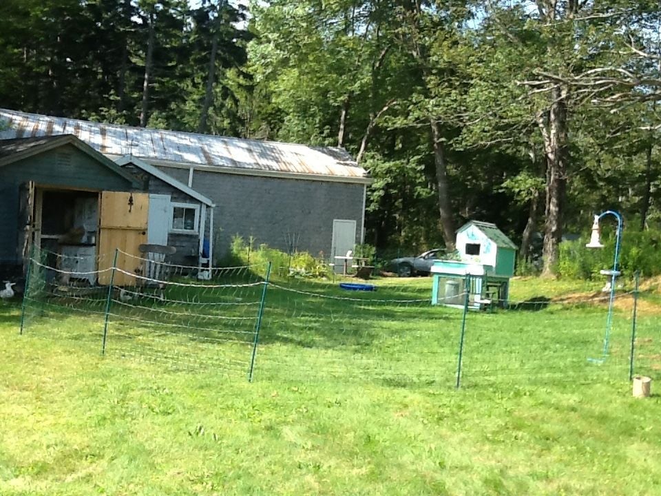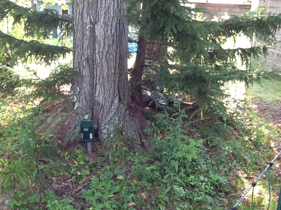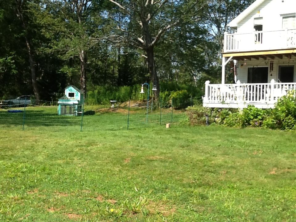 So I was all ready to put the fence up when I realized my calculations were off and I needed another 100ft. to completely surround the coop and the ledge and bushes / trees etc. Ordered and waited and started to think that maybe the fox had disappeared or met an untimely end with someone else…no sign of him/her in 10 days! Got the coop painted, decorated and ready so the girls moved in there but I still was supervising them for forage time before dusk. Thursday night I was lounging in my adirondack chair doling out corn kernels and raisins and chill in with the girls when out of the blue the fox flew through the brush on the ledge and commenced to attack. Everyone and everything went flying as I screamed bloody murder and chased it. It caught more than one but they flew and fought and escaped and I was able to chase it off empty mouthed. Fortunately no bleeding, lost wings or limbs or serious injury but clumps of feathers everywhere! Amazing how bold and quick that fox was - scared the bee-jesus out of me and them. Needless to say supervised outings were not successful and my lull into thinking he/she moved on was delusional. since Thursday. The fencing arrived Saturday and I had some issues driving the 3 ground rods in even at 3ft simply because I live on a ledge peninsula here in Harpswell Maine. However, I prevailed and drove the ground rods in