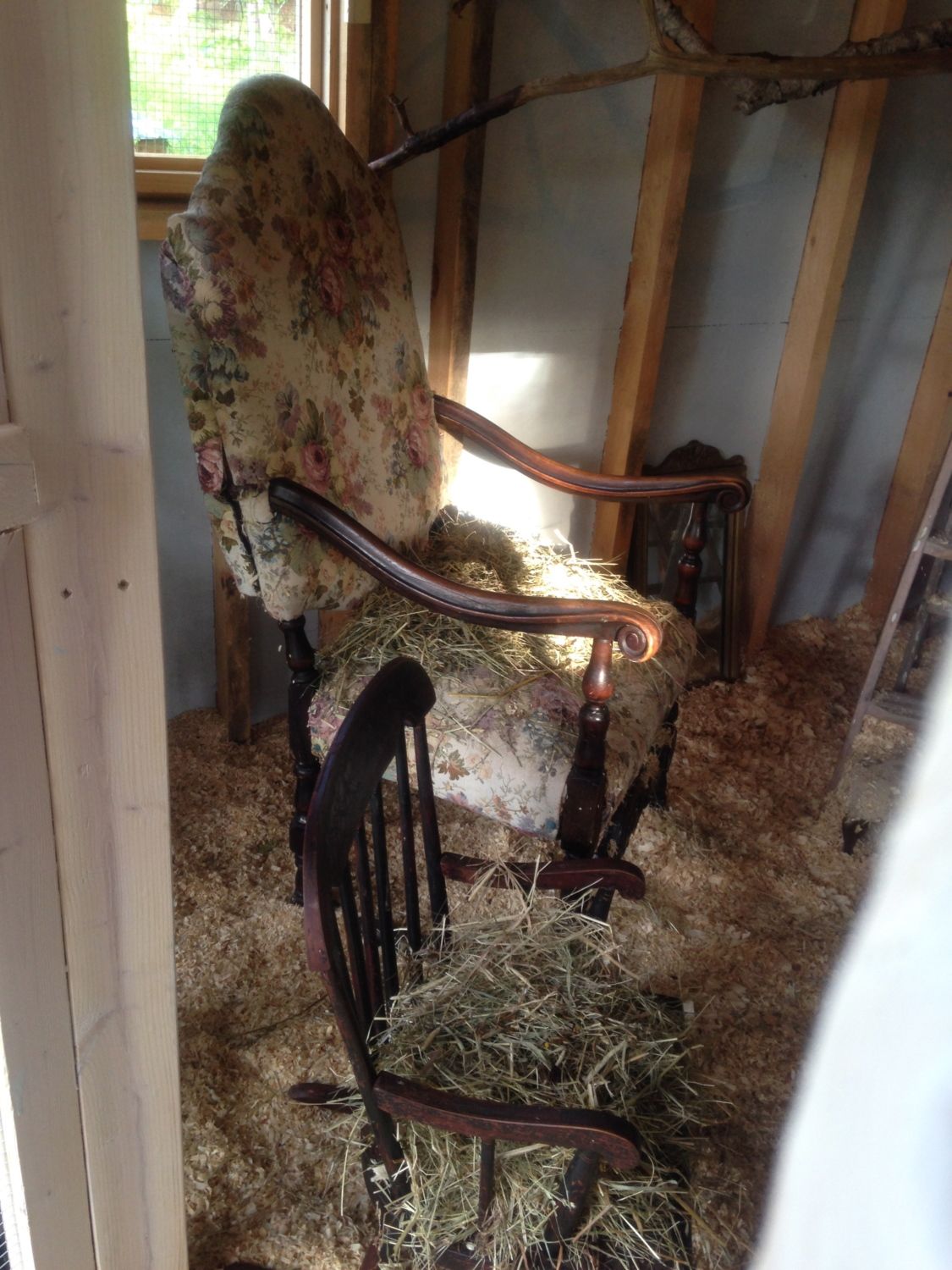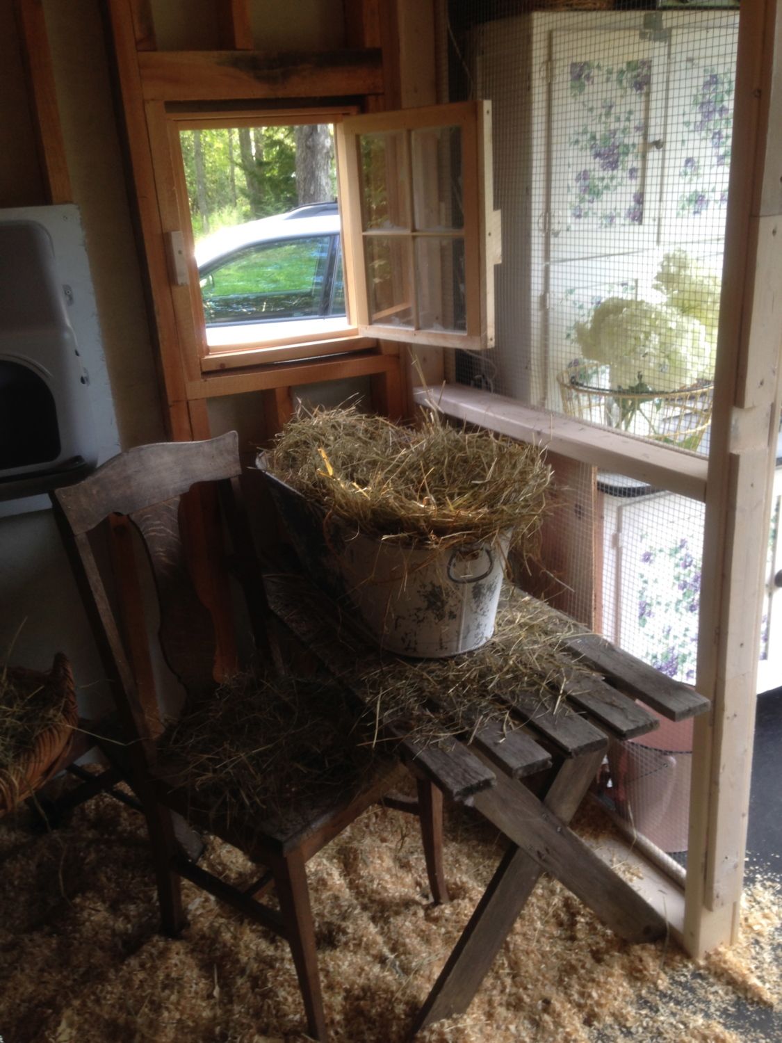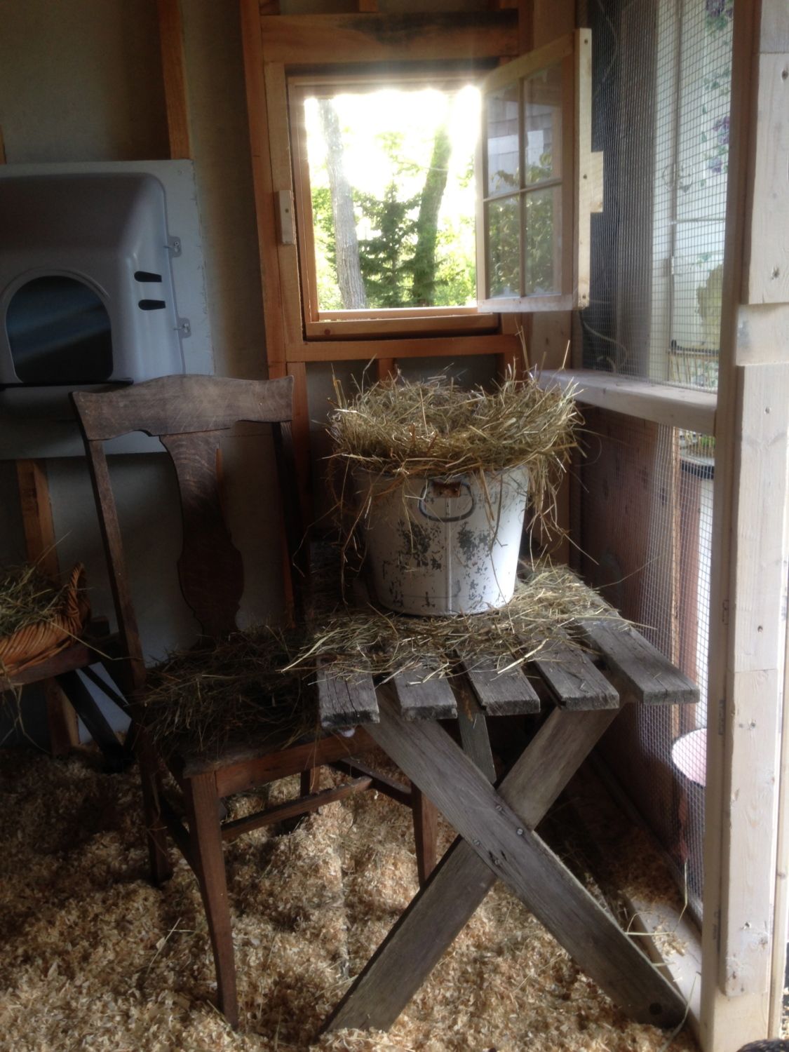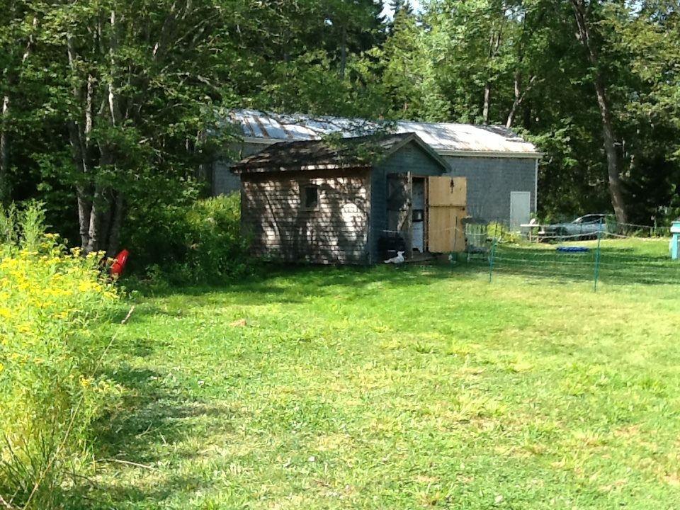 So I was all ready to put the fence up when I realized my calculations were off and I needed another 100ft. to completely surround the coop and the ledge and bushes / trees etc. Ordered and waited and started to think that maybe the fox had disappeared or met an untimely end with someone else…no sign of him/her in 10 days! Got the coop painted, decorated and ready so the girls moved in there but I still was supervising them for forage time before dusk. Thursday night I was lounging in my adirondack chair doling out corn kernels and raisins and chill in with the girls when out of the blue the fox flew through the brush on the ledge and commenced to attack. Everyone and everything went flying as I screamed bloody murder and chased it. It caught more than one but they flew and fought and escaped and I was able to chase it off empty mouthed. Fortunately no bleeding, lost wings or limbs or serious injury but clumps of feathers everywhere! Amazing how bold and quick that fox was - scared the bee-jesus out of me and them. Needless to say supervised outings were not successful and my lull into thinking he/she moved on was delusional. since Thursday. The fencing arrived Saturday and I had some issues driving the 3 ground rods in even at 3ft simply because I live on a ledge peninsula here in Harpswell Maine. However, I prevailed and drove the ground rods in