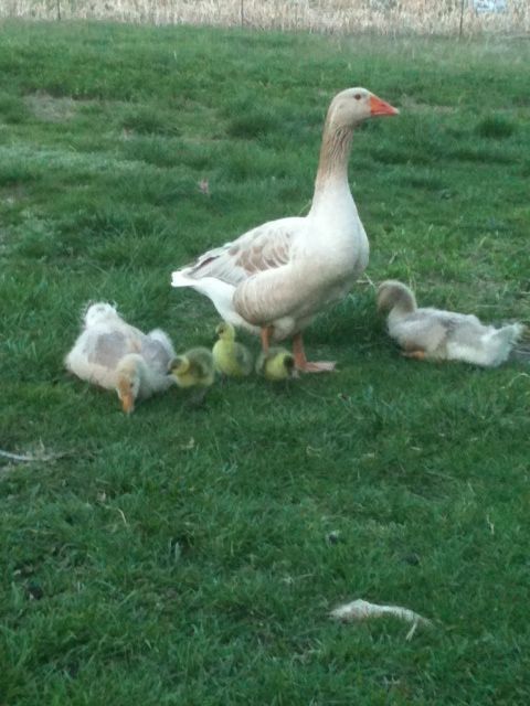 I bought 3 Toulouse goslings at Rural King. We had wanted to raise some geese for the table, and now I guess we will. With it being so warm I wanted to get the 3 little ones out on some grass. I took them down just to meet Boris and the 2 girls. Boris heard them and ran to the fence and apparently called them. They ran from me and squeezed through the fence. He took them and this was them within minutes.