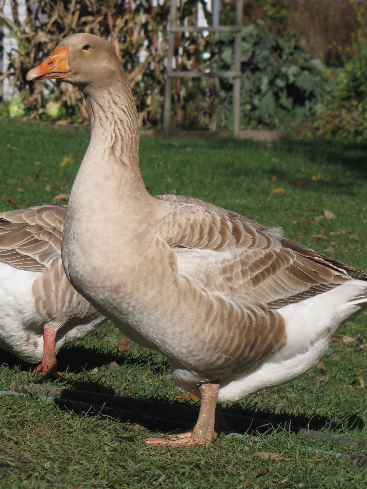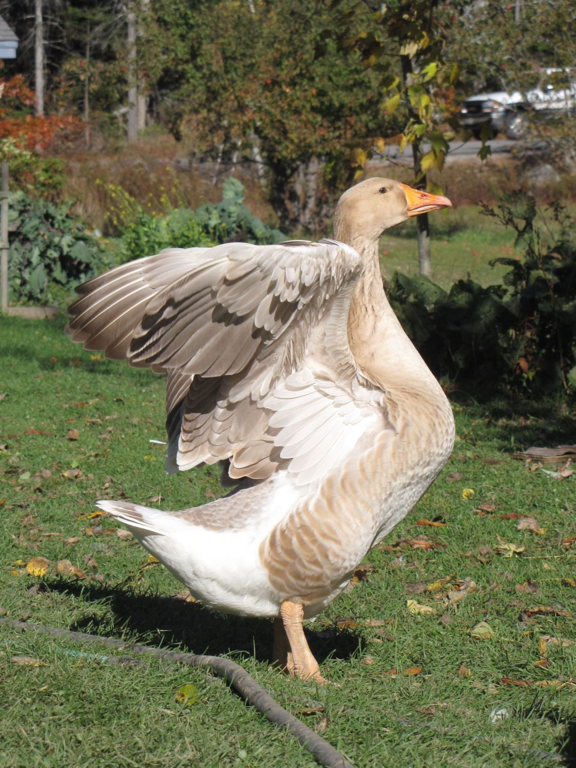 Meet "Eggbert" (she came with the name). She was a house goose at one point, raised solely in the presence of humans and a duck. Geese are exceptionally smart though, and she figured out where she truly belonged in a week. Though she is still friendly, she no longer dependent on people, and now socializes with her own kind.