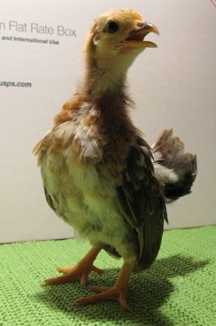 This is Pepper. I think he is a cockerel. A little on the shy side, huddles a bit on the table. No idea what color he will be, but he was a pretty pale buff "chipmunk" color at a day old - same exact color as Nilla in fact.