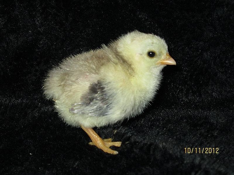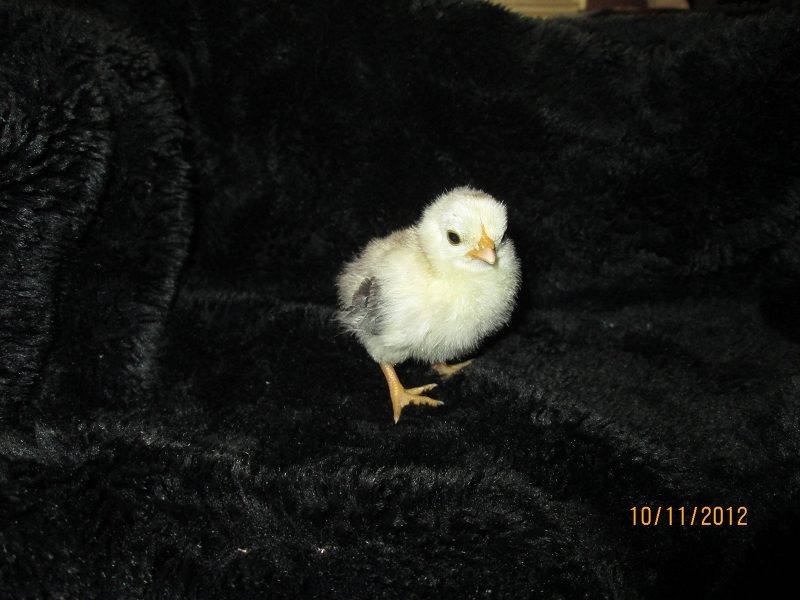 My newest Serama! 5 1/2 days old now, and getting some wing feathers in. She is mostly white/creamy all over, with the darker dun color down her back, and now her wing feathers are coming in at least partially dark...chocolate? It's not black for sure, maybe blue? I DON'T KNOOOOW >.< Serama color... making us guess forever. LOL!