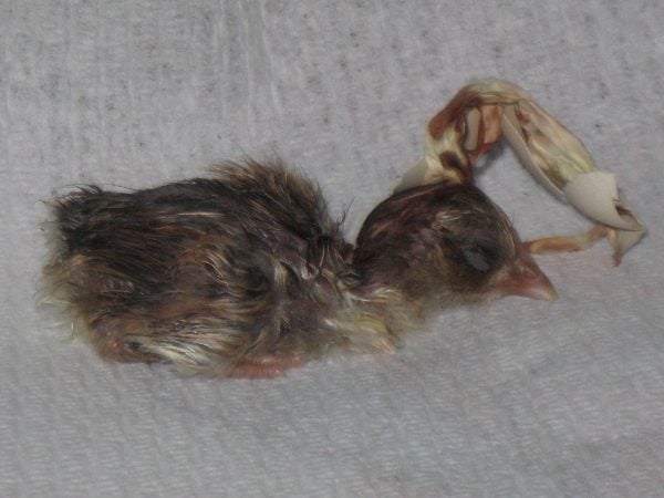 Well, I lost another chick last night, but the other 3 made it.  I had to help them out as they were getting shrink wrapped despite my attempts at keeping them moist.  So I have 3 chicks, which I am very thankful for.  They all seem healthy.  On one, I didn't notice it had part of it's egg attached to it's head.  It is an unfortunate thing as she/he now has the name egg head.  I can't resist!