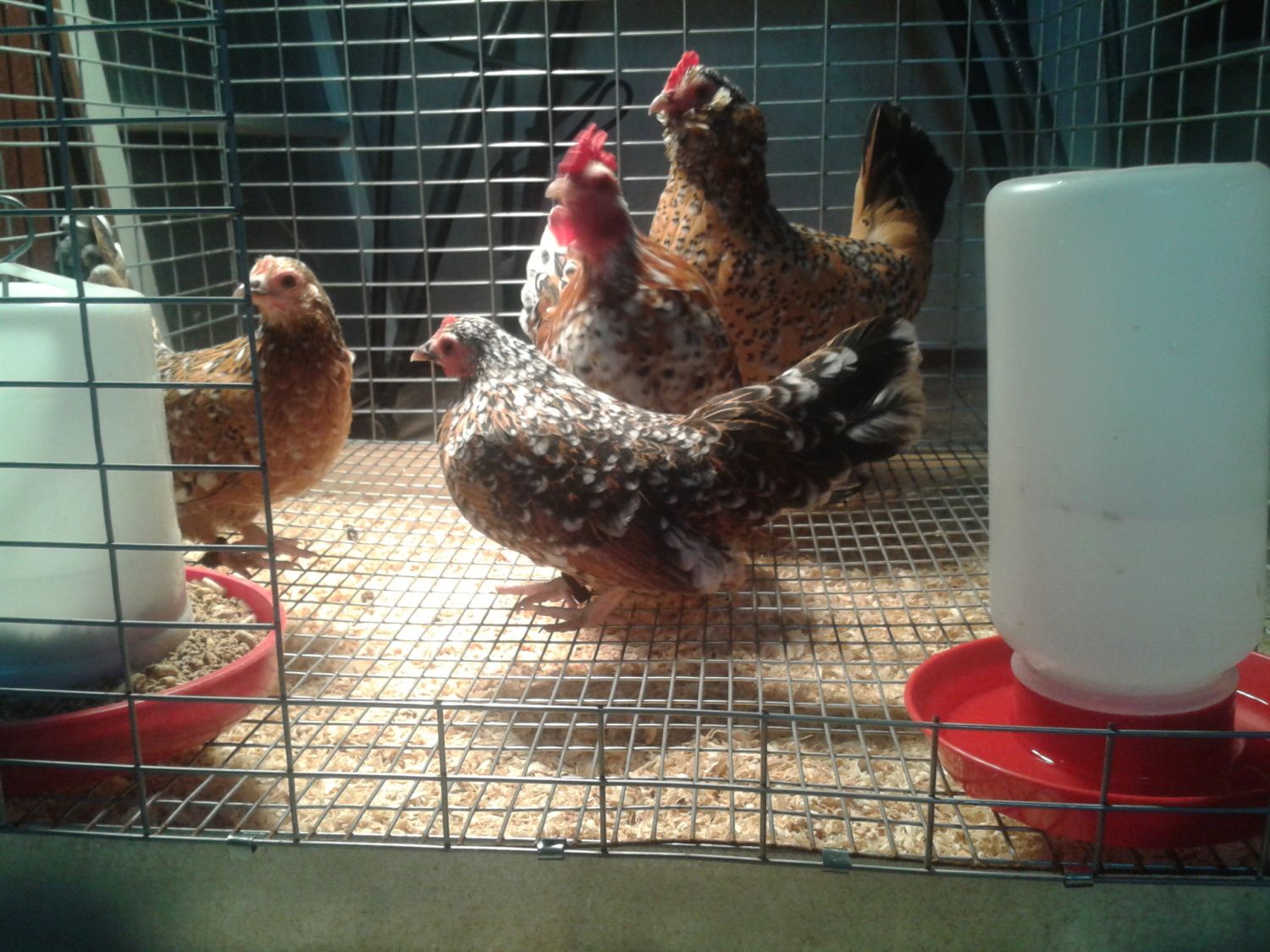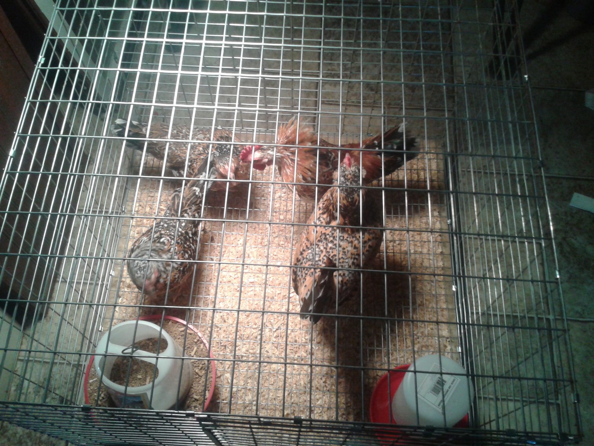 ok, I broke....at 6am, it was only 38 in the coop and low twenties outside. We had a huge frost and I couldn't stand it. They were bunched up in a nesting box and shivering. I pulled the light and brought them in and they are still in my kitchen floor. I hung the light above them about 3 feet and they are still bunched up under it in the corner of the cage. In a moment of hunger, they moved around a bit to grab a bite and a drink and I took these shots. I don't think I have posted them on here. I couldn't leave the little D'uccle alone outside, so she is in there too. They are all Mille Fleur colored. I will let the frost burn off with the coming sun and then try to put them back out in the run. They may become night-time house chickens. But that might make it worse going in/out with temp changes.