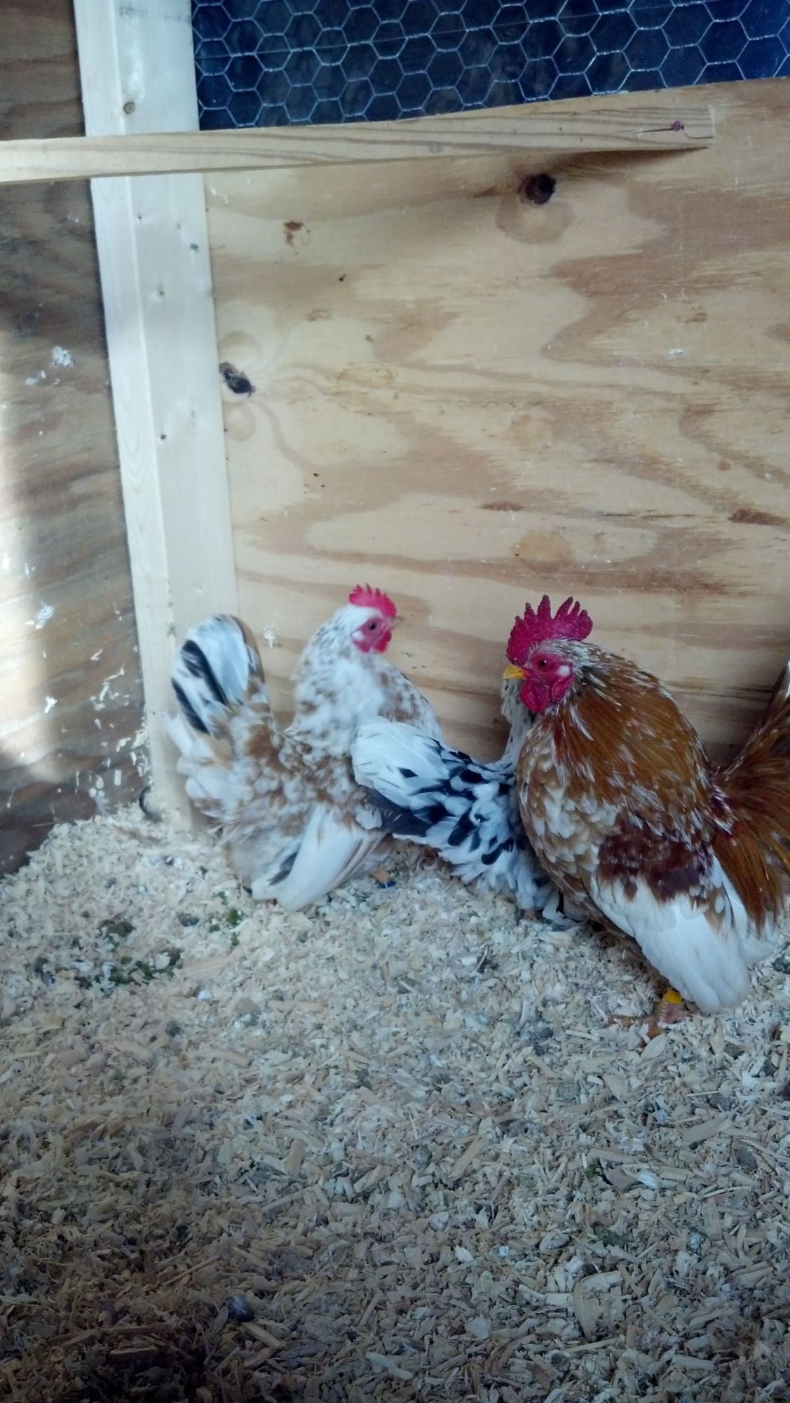 Here's the problem. Four roos, two hens. I want to get to the point where I have two hens for each roo as soon as I can--they're lovely lads, but the frustration/argument quotient is growing for lack of sex, and it isn't fair to anyone involved.