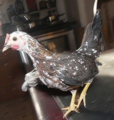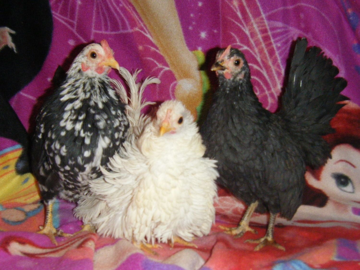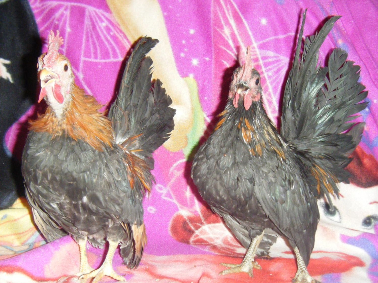 Looks like you have a mottled pumpkin ( the bottom one) , a mottled black above it, and the roo looks like mottled pumpkin too. I don't see cocopop at all. They are really pretty though!!Hello everyone! I have followed this thread for a while now and I need someone to help me with my seramas. I want to know if they have any potential as breeders. I do not plan on showing. I would love some help with their color as well. They are from Cocopop lines. The lady I bought them from said that they were "Cocopop". Is that their color?