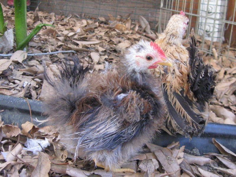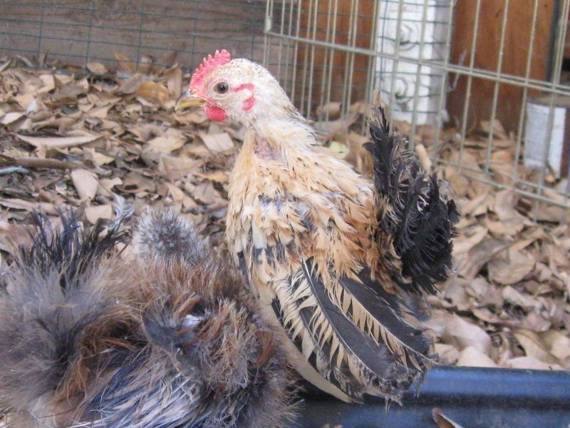 and here are the babies. Ron has something in his genes. Maybe a half/showing up silkie feathering gene? I don't know but his feathers are frazzled looking. He's not sick and has no bugs on him, so I think he just looks that way. He and his brother, Cedric are almost 7 weeks old
