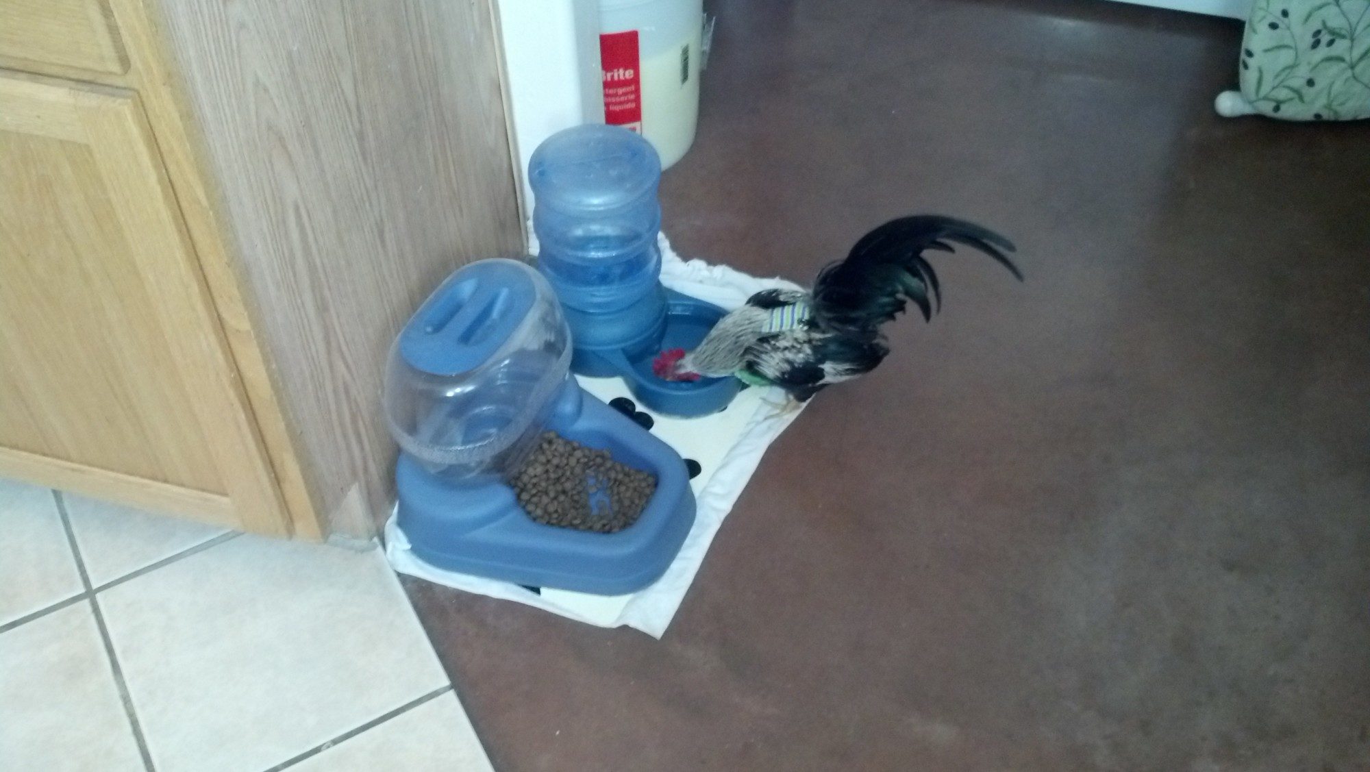 He finally discovered the dog station. The water is great, means I don't have to fill his water bottle in the bedroom as often. But is the dog food bad for him? I haven't seen him really go at it, but he does occasionally peck at it.