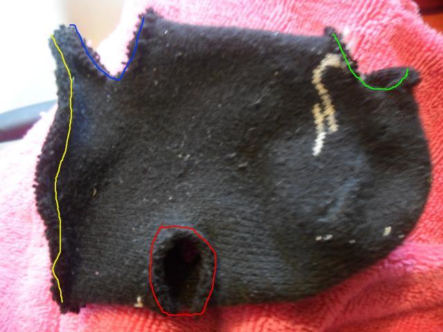 Here is a pattern for you for a diaper I used for my Emu. Basically the same. Red is the leg holes, blue is a strap that goes around the front of the breast, and yellow is the edge which is cut from the sock and would be the front, and green is the tail hole. I just cut up a maxi pad and put it in the bottom to absorb some poop.