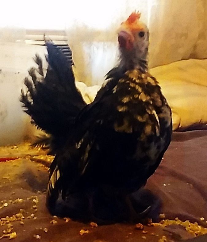 This was the day they came. They spent some time with my silkie roo, "Fuzzy," while I got their cage ready. He is a very sweet, docile guy. They hid under his "skirts" the whole time! Poor babies!