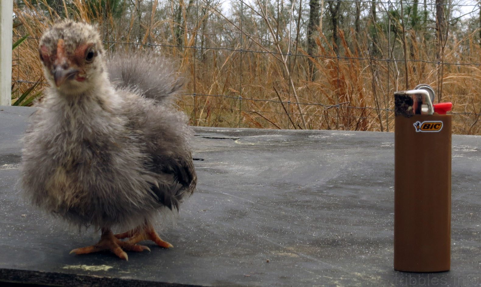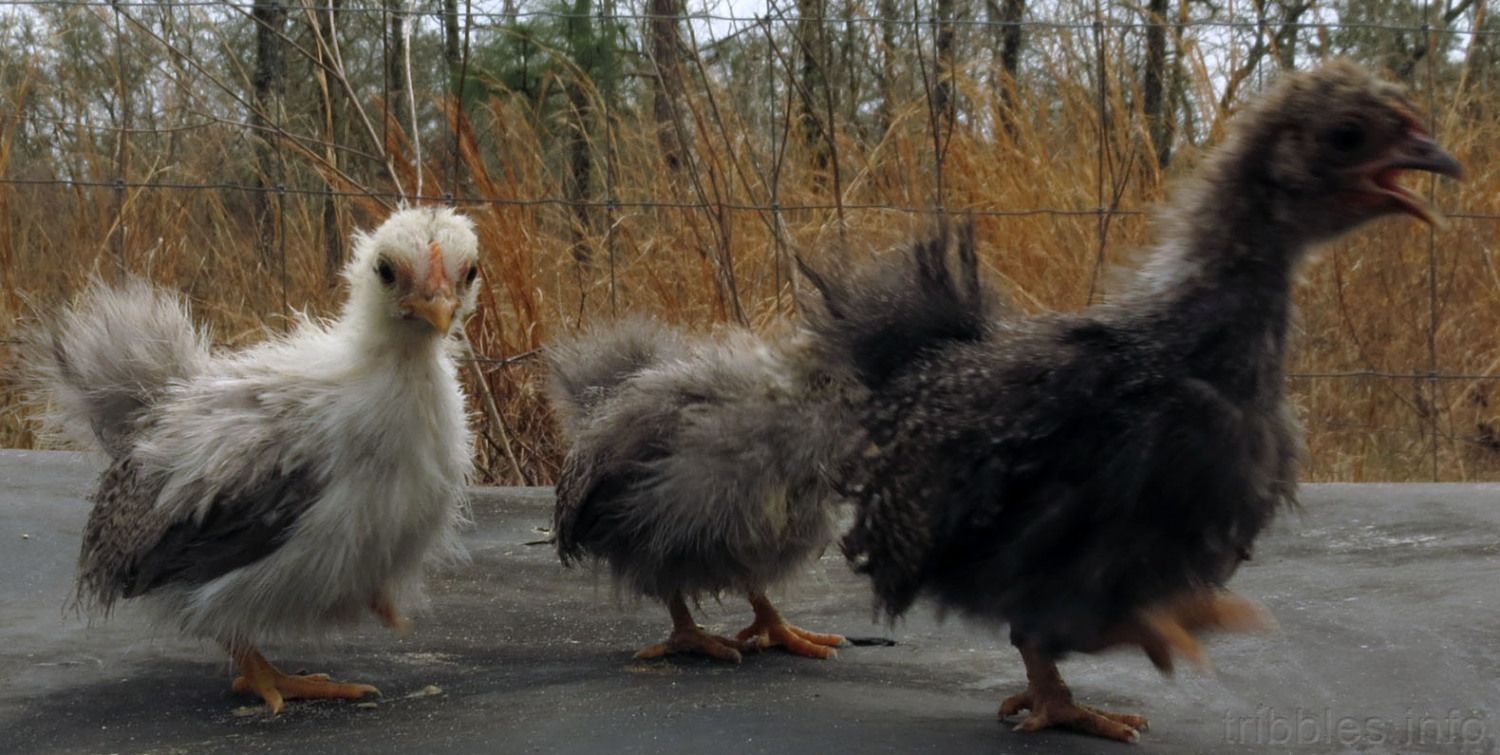 I tried to take a portrait of Dorothy and she's gotten her chest all dirty. Tribbles are usually self-cleaning. I've got them packed in a pretty small day cage. Worf stays with them most of the time too. He terrorizes my larger pullets that are his future mates but he's like a hen with these 8 week old birds. 2 of Dot's Sisters who are also pretty small. Ha, I just realized how fitting Dorothy's nickname is.