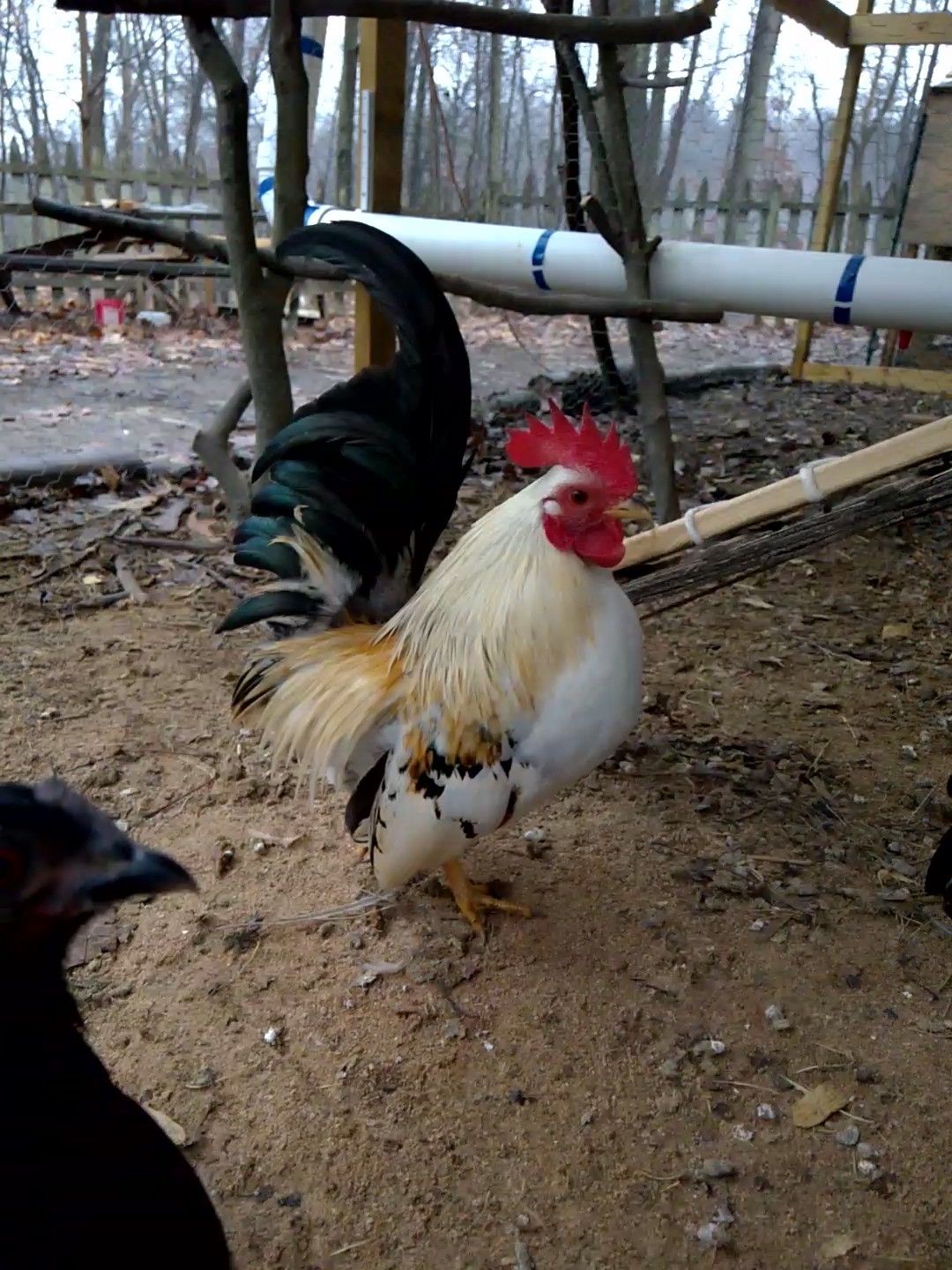 Roo#2 is alittle more horizontal and has squirrel tail and too much curve in the sickle feathers (genetic OOPS caused from japanese bantam) his back too is alittle long, his chest is higher and more desirable than #1.
