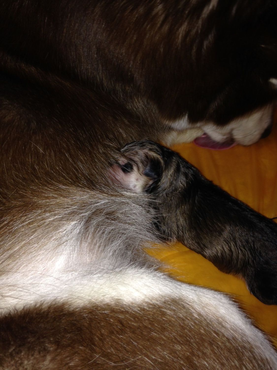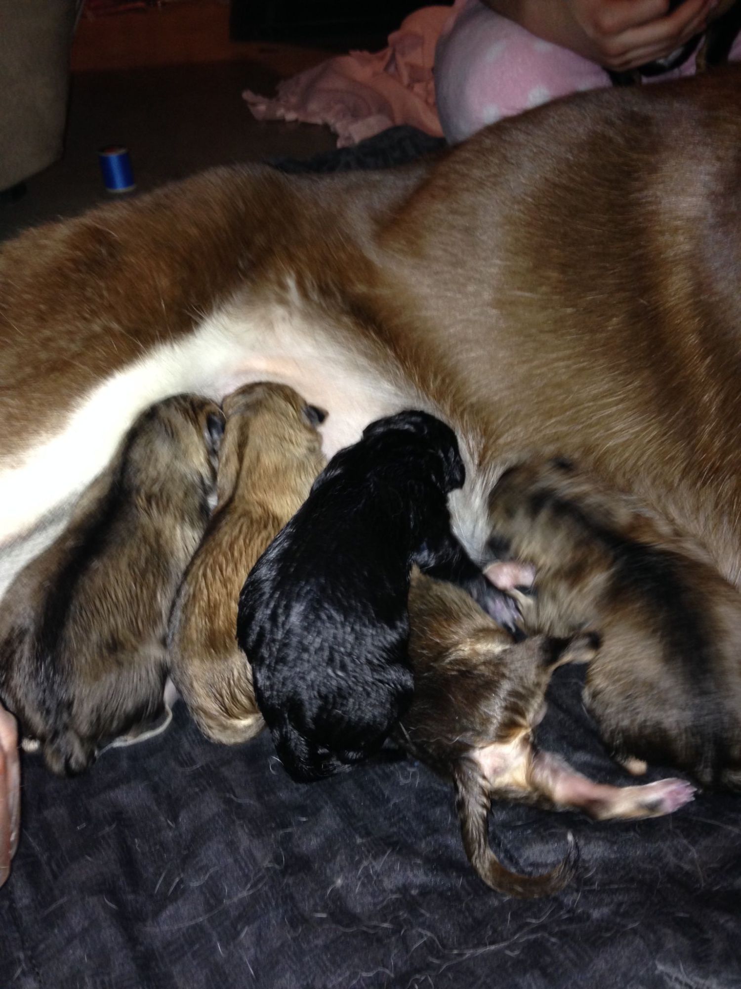 6puppies! We added another dark chocolate with lighter chocolate hound marking! 5males 1female! I'll get pics tomorrow. The family is sleeping!