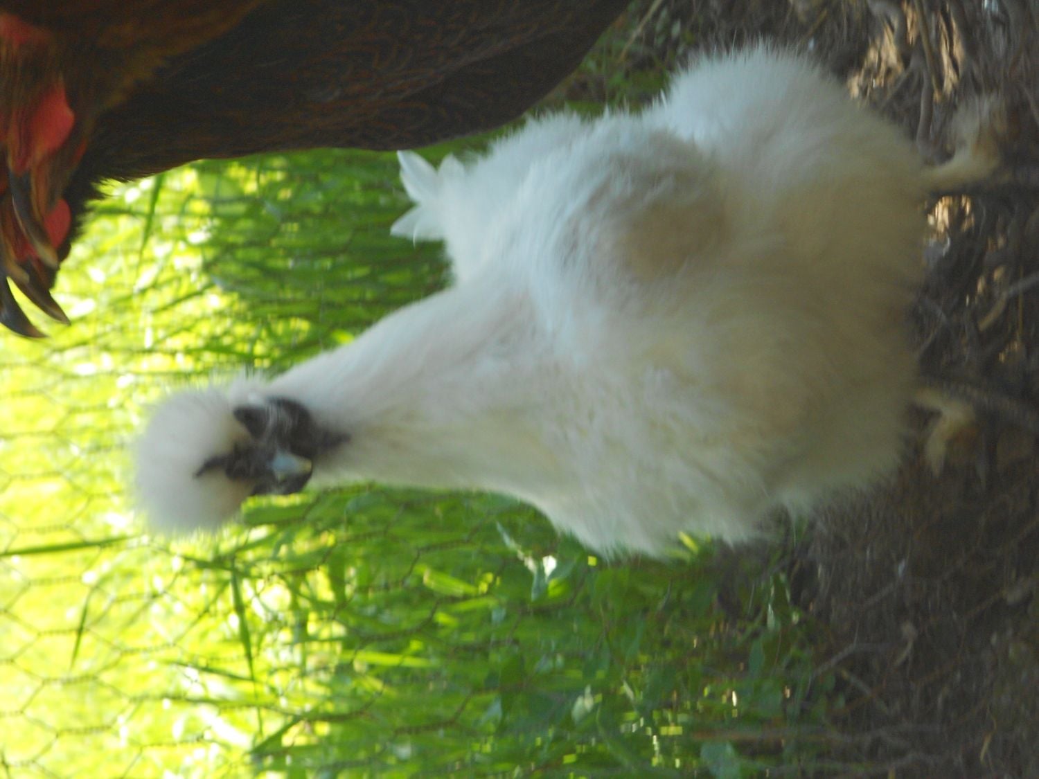 She likes to boss the roosters around and she is the runt of all the Silkies she is only about 6 inches tall. The roosters are huge compared to her but she still freaks them out. I think it is the hair... HAHA!