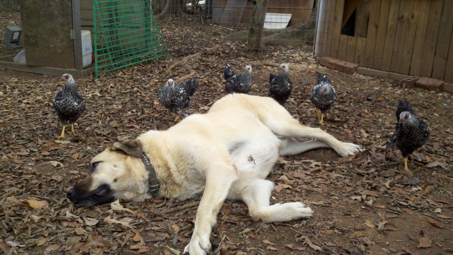 Now that hes no longer a rambunctious puppy, he's pretty mellow with the chickens. I don't keep him in the run with them all the time, but when he's with them, he just finds a shady spot and flops down to keep watch. He'll bark at large birds like hawks and vultures if they fly overhead, and if he does, the chickens will all run for cover at his bark. It's the coolest thing. He hasn't killed any mammal predators, but he's killed his fair share of snakes. Since I've had him, i haven't lost a bird to raccoons, which used to be a huge problem here. I don't think they want to mess with my big boy :)