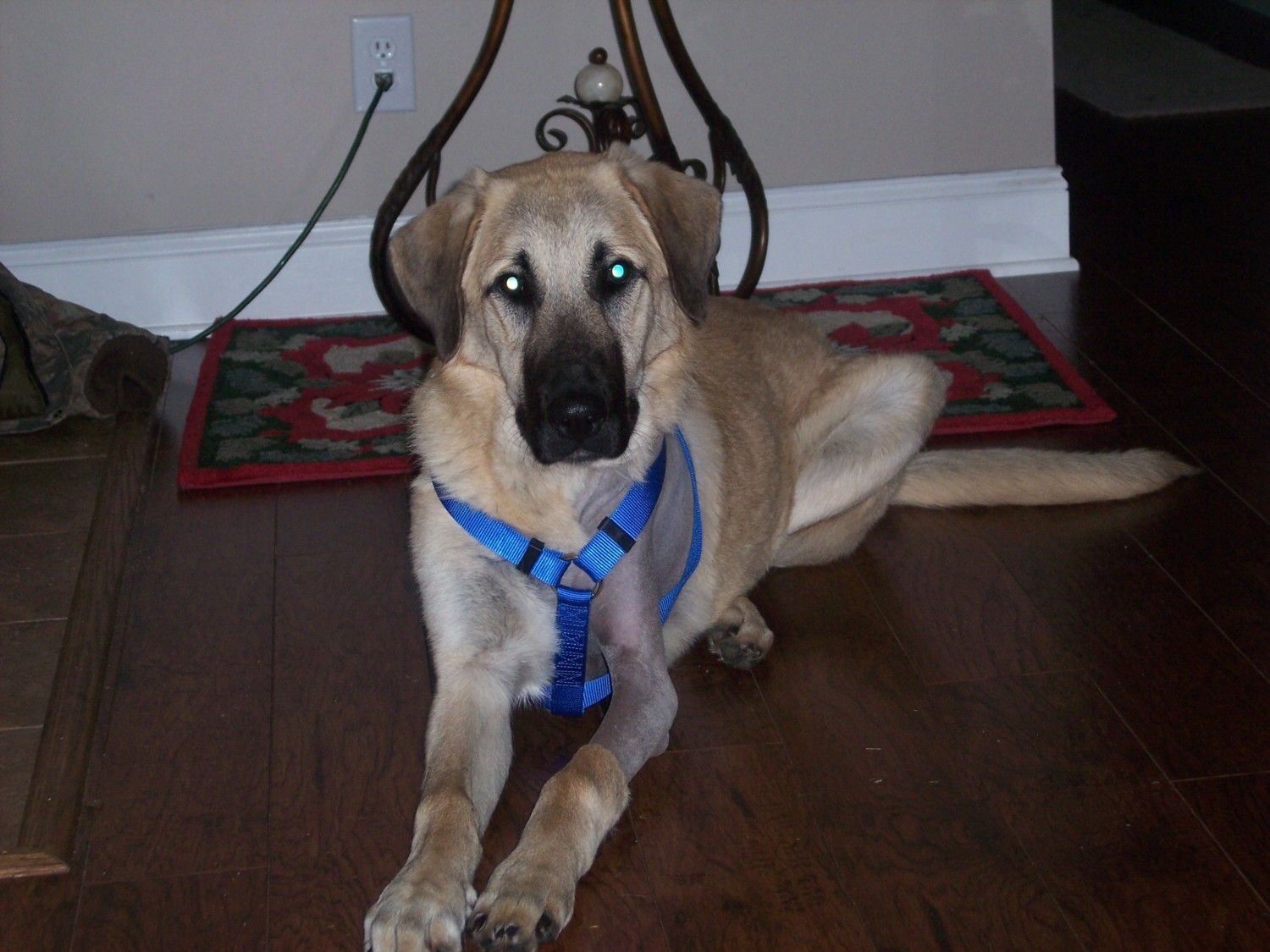 Him in the house after his surgery. we had to help him walk with that harness for a few weeks. He was so cute and all legs and paws at that age