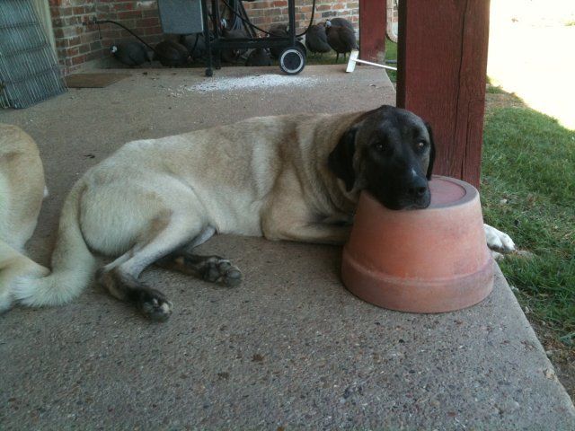 Crappy pic of Riley (lying down) and Sinsi out in the pasture keeping an eye on the guineas.