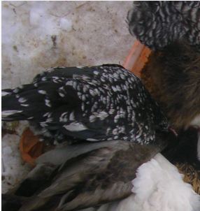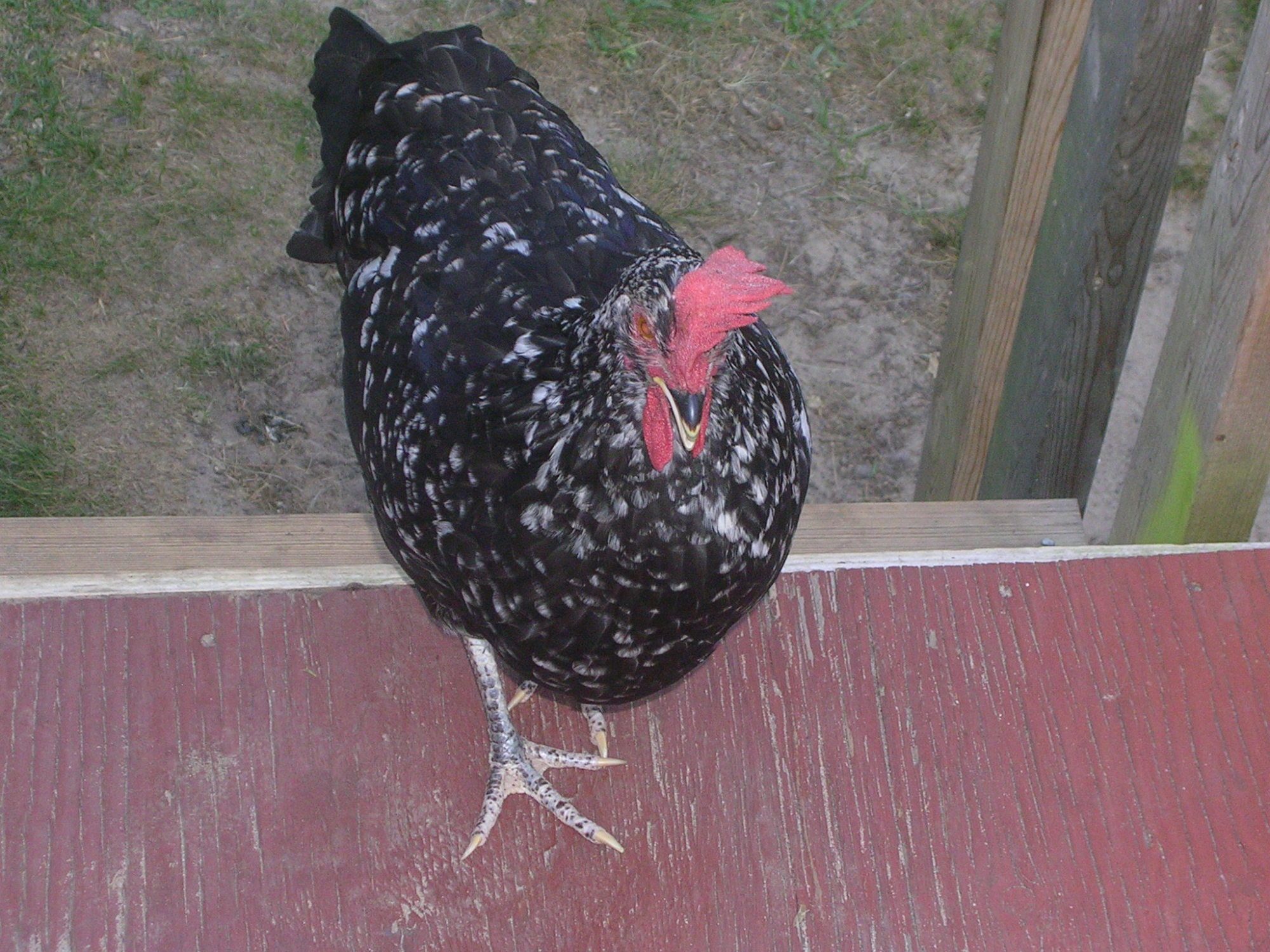 The comb is incorrect. It should e large and lopped over to one-side with the first point pointing up. Having said that, the comb is only worth a couple of points. This female has a lot going for her conformation-wise. She is a far cry better than most stock one sees from a hatchery. It would be good to see her from above, but from the side she has a nice body type. She should be a bit longer in the leg, but her tail angle is very good, which is rare in hatchery Anconas. Like so many Anconas, her mottling is in need of work, but that's OK. I'm assuming she's a hatchery bird, and if she is, she's one of the best hatchery birds I've seen.