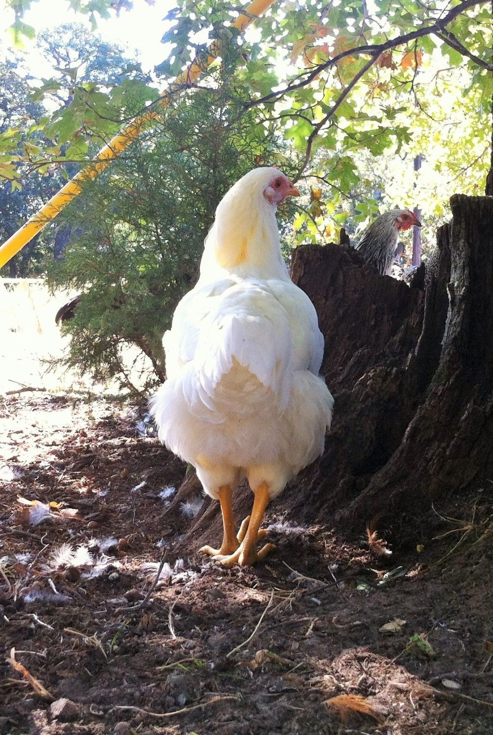 She looks like a White Rock to me. The body type and leg color are right for it. The yellow tinge in the plumage can be from too much corn or too much direct sunlight. Some white birds yellow in the sun or if they have diets too heavy on the corn side. Sometimes, some lines of white birds just yellow too much.