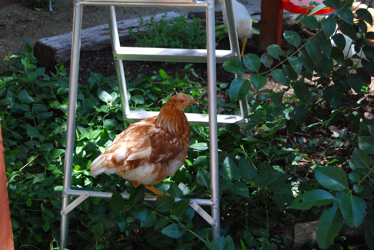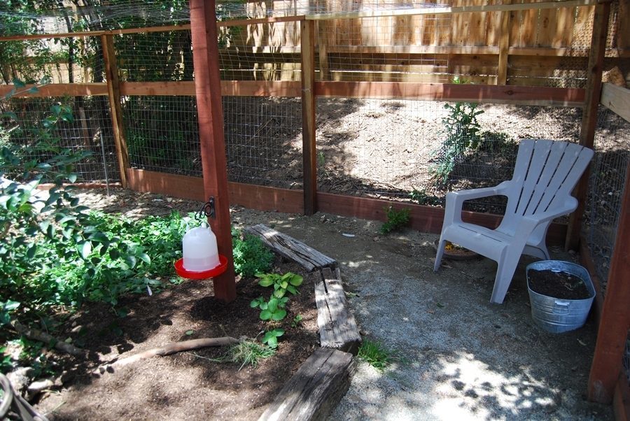 There is thick patch of Vinca that was overgrown when I bought the house and seems to hold up to the chicken abuse really well. There are also about 2 dozen strawberry starts planted under cover of the vinca and it makes a nice 'hunt' for the girls (who get WAY excited whenever a new red strawberry ripens up and gets discovered). There is a badly abused texas privet that keeps growing back no matter how badly I hack it. 2 wild hollyhocks that just showed up this year, 2 hostas, a patch of chamomile (which also holds up to chicken abuse really well, and smells like heaven). and a couple of odds and ends from my regular garden that I move out to the chicken run when I can't find anywhere else for them.