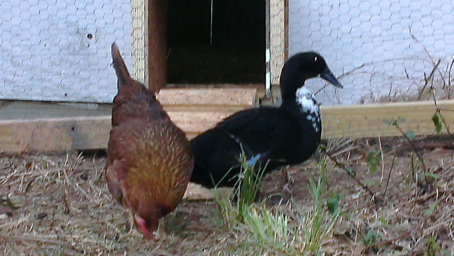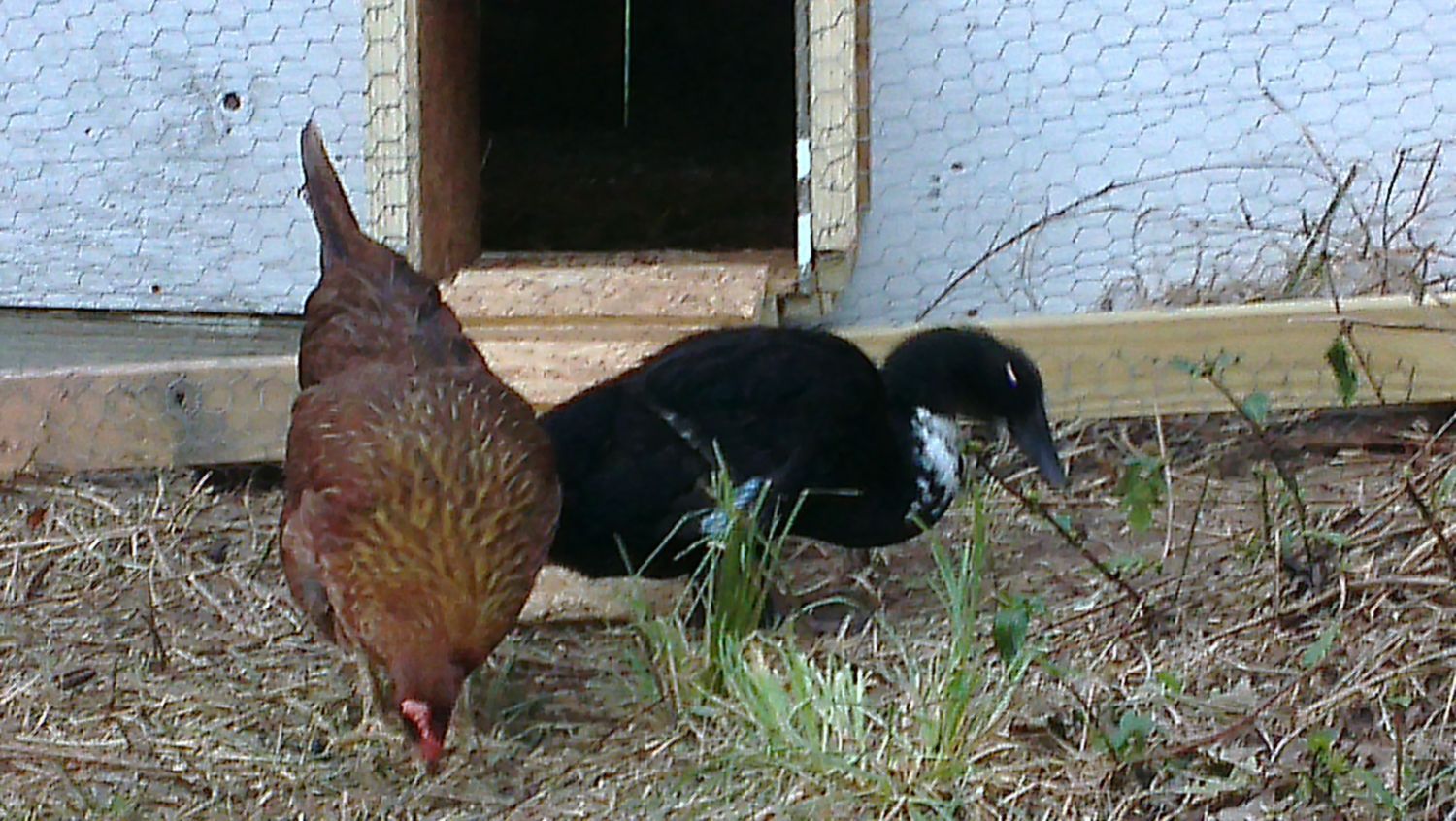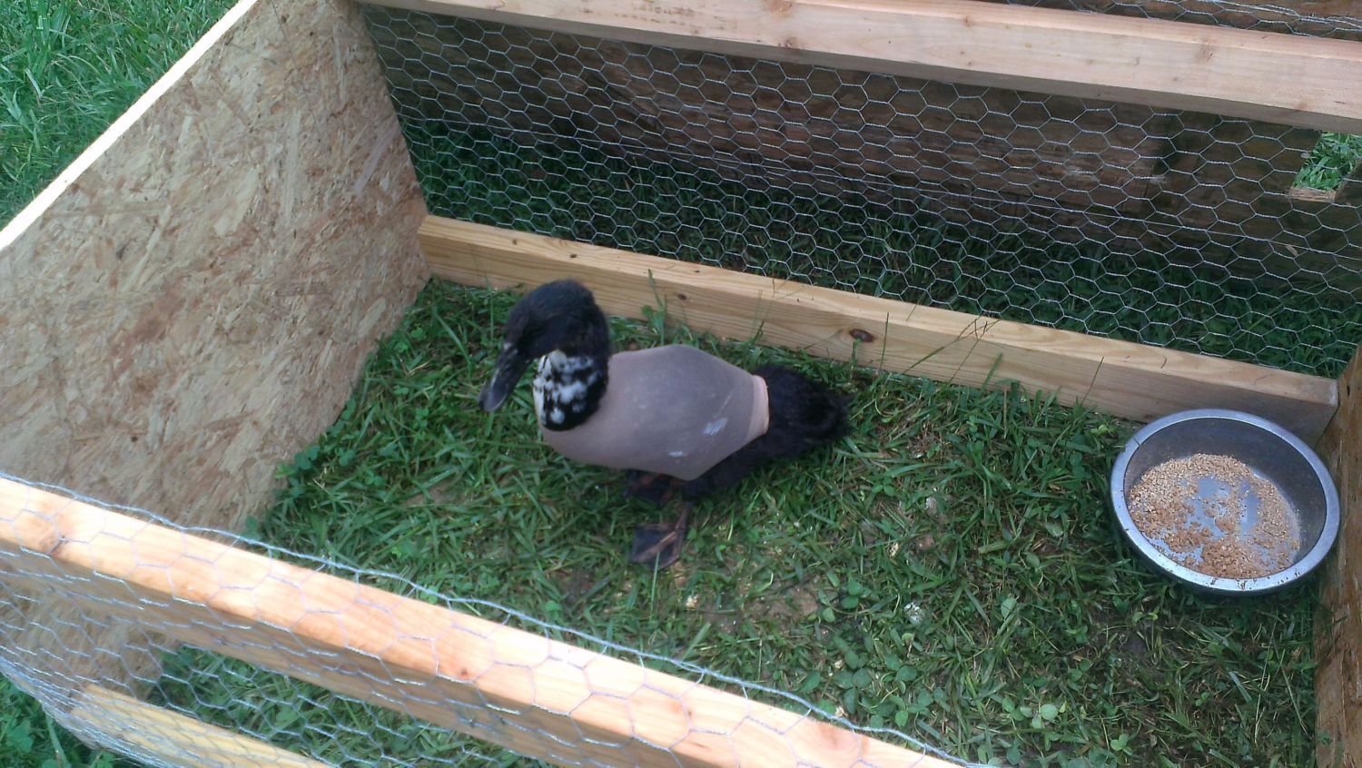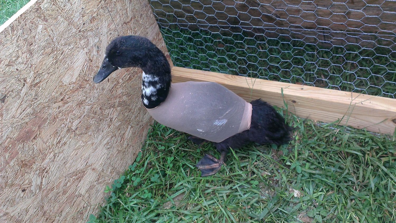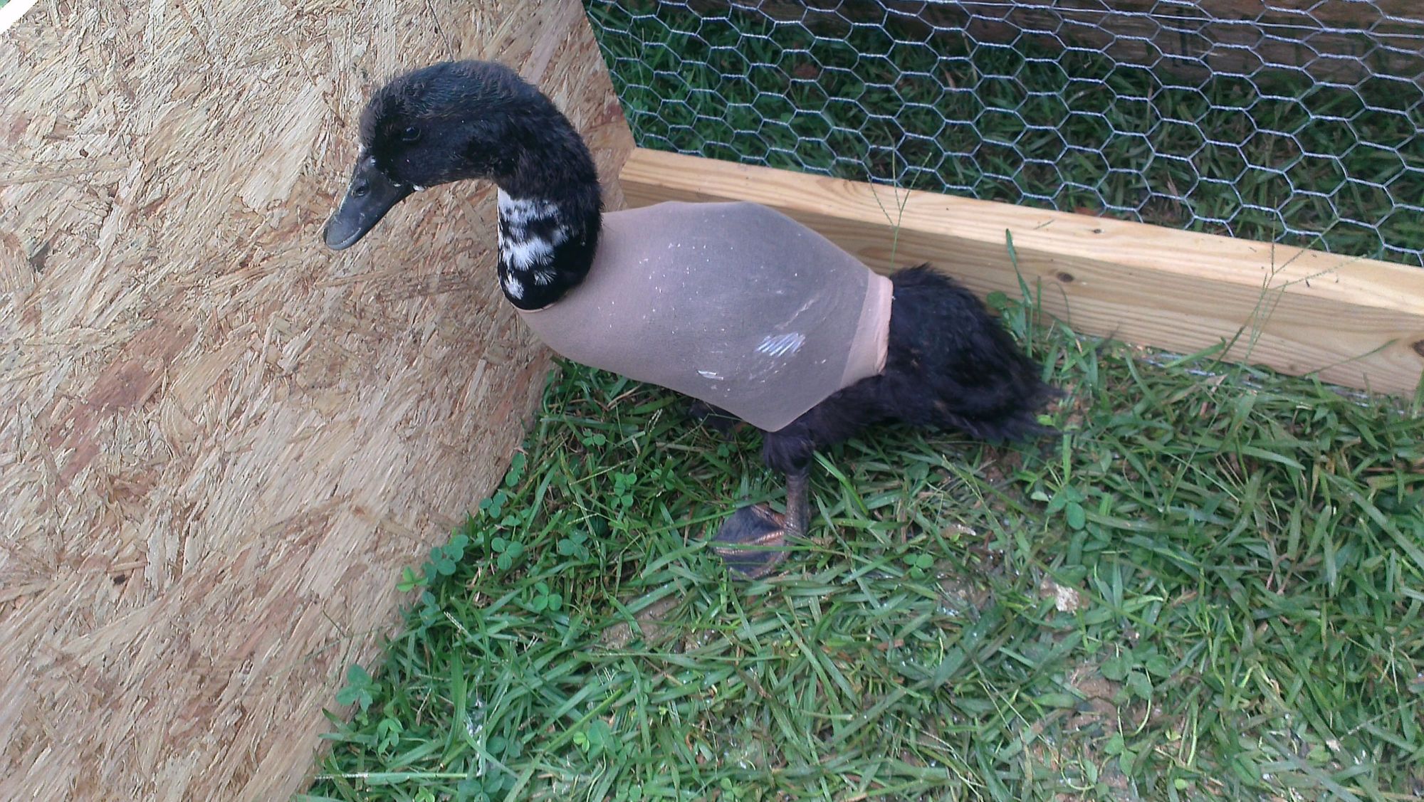 The knee high slid down. He was looking good, but now it's right back where it was. I'm gonna make him his own pen this week and will be trying again. He doesn't like to be away from my chicken hens though lol. He's been with them since about a month old and I swear he thinks Lola is his mama