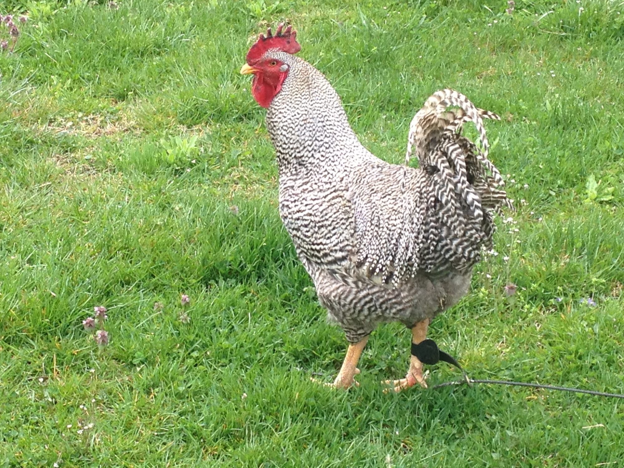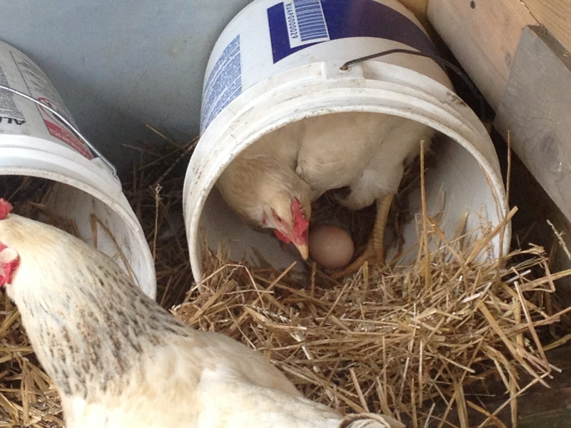 I traded him (and a few bucks) off to two DEFINITE hens (a White Rock, and Columbian Rock are what I suspect them to be, they're extremely popular backyard fowl in my area) from a friend of my Dad's on Saturday. Today, my lovely little WR gave me my very first egg! (Aside from the banty eggs I've been getting.)