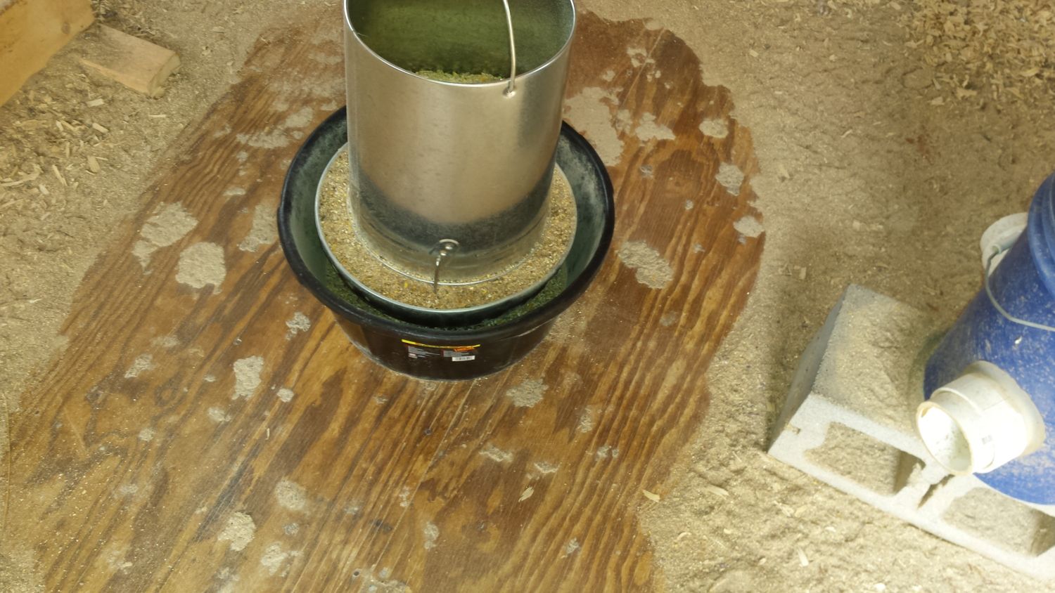 I have been using the PVC/bucket set up and haven't had any luck with preventing large amounts of feed being wasted. Here is the original set up: