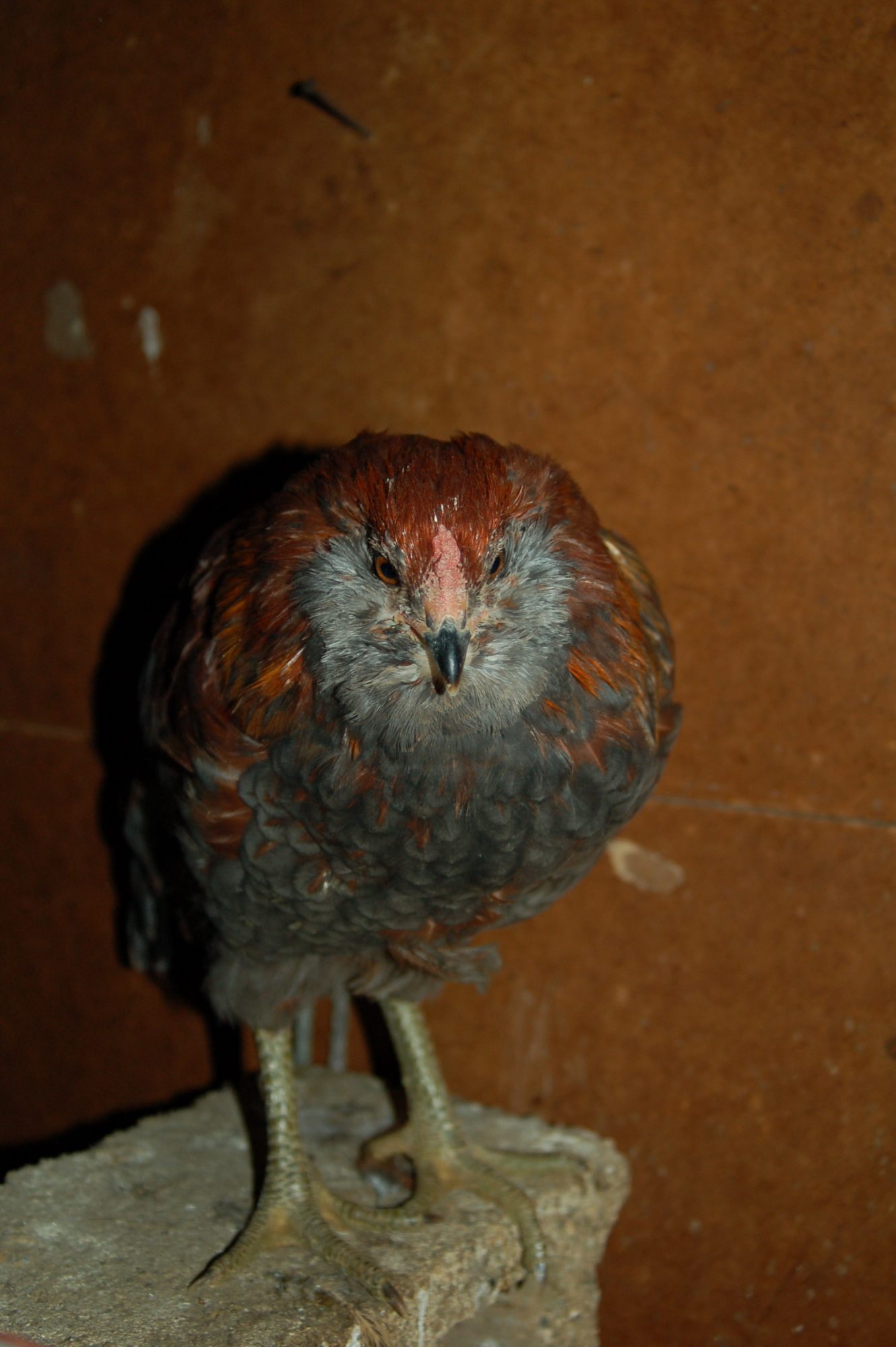 The gold-headed brown-bodied chicks can occur as both cockerels and pullets, but the cockerels get dark red splotches and the females retain a light dun-brown partridge look.