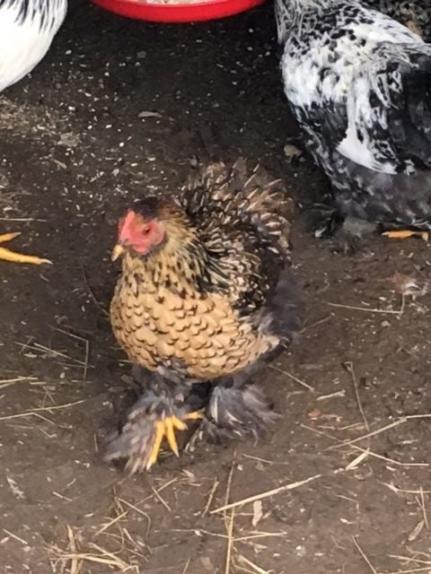 In the beginning, I thought these were hens because they didn't have combs or a waddle. I know they are some sort of feather-legged bantam but what breed I am unsure. All the chickens are over 6 months of age. I couldn't tell you exactly how old they all are though.