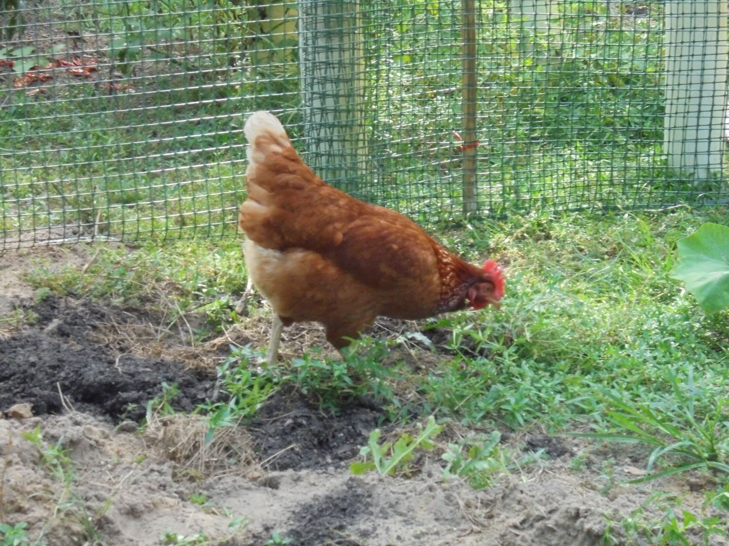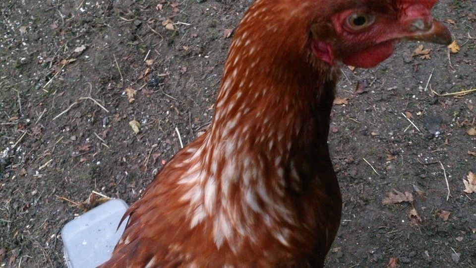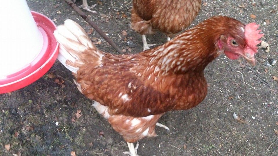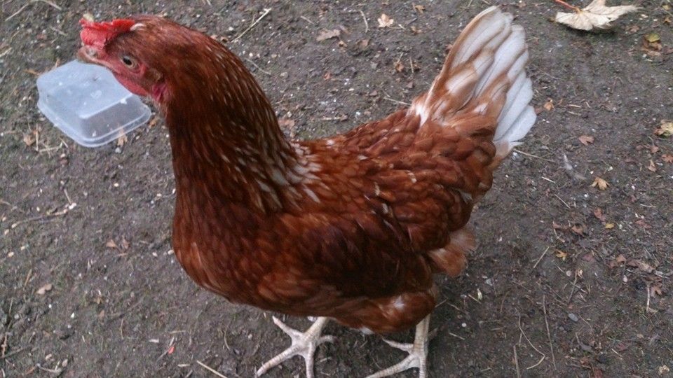 I did wonder if she could be, although she's a tad darker then ones I've seen before. Very docile, very friendly, but a consummate escape artist! She's painfully thin, which is making me drag my heels a bit over finding her owner.She looks like a red sex link to me!