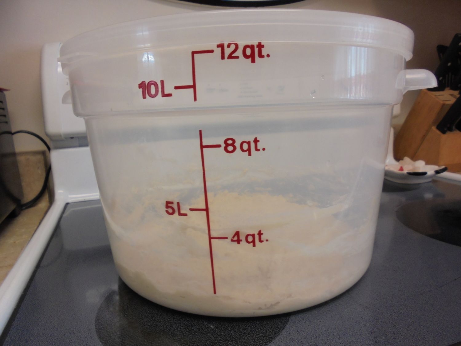 You could use the dough at this point but it will be one very wet, messy dough to work with. It's much easier to work with if you stick the dough in the refrigerator at this point and leave it overnight. This is what the dough will look like in the container the next day: